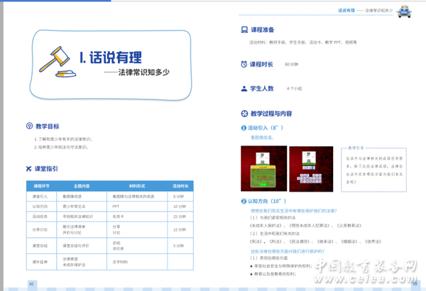 依據青少年認知發展水平,通過課程增強學生的知法意識、守法意識、法制自我保護意識、法制防范意識以及樹立用法律手段處理現實問題的意識等。希望青少年在知法、守法的基礎上,能以法制的觀點去看待和解決生活中遇到的法律問題,通過課堂觀察和實踐,初步形成運用法律手段維護自身合法權利的能力,而最終將法制意識內化于心,外化于行,為健全人格和他們未來的和諧發展奠定基礎。