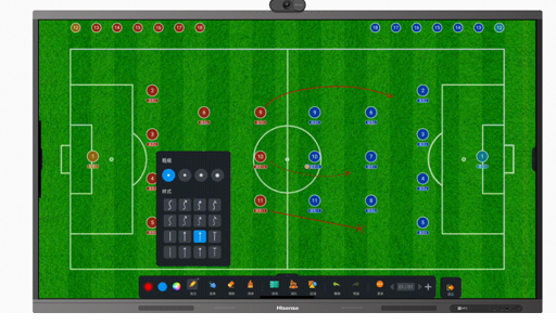 作為一款專業的足球戰術板應用,戰術講解功能是重中之重。海信智慧足球戰術板支持插入賽事圖片進行對照分析,且預置了多種樣式的戰術線和圖形等,可輕松完成各種場上走位及進攻區域的示意標注,并支持一鍵清屏、保存歷史記錄等,高效便捷。