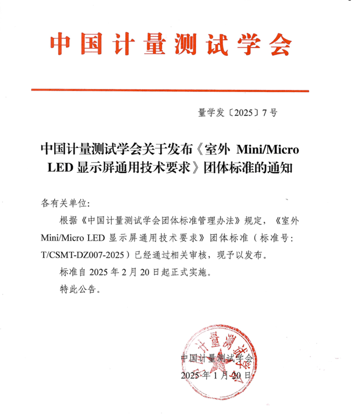 近日,中國(guó)計(jì)量測(cè)試學(xué)會(huì)正式發(fā)布《室外Mini/Micro LED顯示屏通用技術(shù)要求》標(biāo)準(zhǔn)。海信憑借在LED行業(yè)深厚的技術(shù)積累和影響力,主持此次標(biāo)準(zhǔn)制定,再次彰顯了海信在LED顯示領(lǐng)域的專業(yè)實(shí)力和行業(yè)地位。