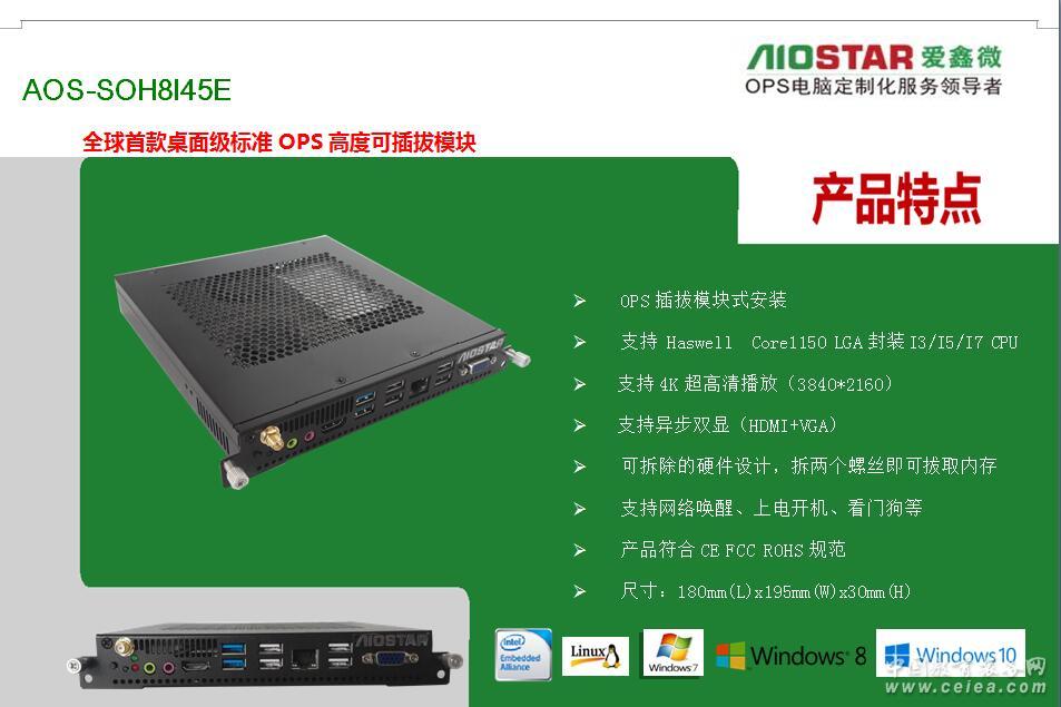 產品詳細介紹深圳市愛鑫微電子有限公司為更好的配合不同廠家的要求,可提供OPS主板與OPS準系統的方案配合各個廣告機,觸控一體機廠家,多媒體壁掛式教學一體機,數字標牌,錄播觸控一體機,同時保證所提供OPS主板與OPS插拔式電腦/OPS-C插拔式電腦主機是完全按照INTEL OPS規范定義的,完全支持鴻合教育一體機、東方中原教育一體機、創維教育一體機、康佳教育一體機、中銀液晶觸控一體機、中電數碼教育一體機、海爾觸控一體、TCL觸控一體機、KTC/HKC/HPC等各大交互式教育觸控一體機廠家,愛鑫微電子提供專業的定制化服務OEM/ODM. 聯系電話:18620397178 QQ:46078934 現階段我司已推出了一系列OPS電腦方案如下: 頂極OPS插拔式電腦方案:H110+6代CPU+2G獨立顯卡(GT730/GT850/GT950) 高端:H110+6代CPU (市場最新方案 4K極清方案)歡迎客戶取樣測試。支持4組USB3.0+3組USB2.0+3組異步顯示(VGA+HDMI+DP)+3組網口(可以直接接IP攝像機進行錄播與監控或者網絡內外網隔離進行封標) 中高端:H81+4代CPU/HM86+4-5代CPU(市場主流) 中端:H61+2-3代CPU/HM65+2-3代CPU(高性價比) 低端:baytrailJ1800/J1900無風扇低成本的OPS電腦(幼教觸控一體機專用) 深圳市愛鑫微電子有限公司(以下簡稱“AIOSTAR”)是一家集研發、生產和銷售于一體的高新技術企業,同時是Intel、AMD、NVIDIA等芯片廠商緊密的合作伙伴。公司主營工業主板(ITX/3.5寸/NANO等)、媒體播放主機、OPS主機、OPS可插拔式電腦模塊、OPS主板、BOX-PC、網絡安全硬件平臺、服務器、工業平板電腦、一體化工作站等產品。目前,產品已廣泛應用于DS、MIDS、IWB、POS、自助查詢、零售金融、工業自動化,智能交通,網絡信息安全,通訊、智能安防,云計算、石油石化、醫療、軍事裝備等多個領域。公司高度重視客戶的需求和滿意度,針對不同的客戶需求,能夠快速做出積極的響應,為其進行量身設計并提供個性化的OEM/ODM服務。 愛鑫微電子本著以“人才是企業的財富,效益是追求的目標,發展是永恒的主題”為宗旨;以“客戶至上,品質為尊“為原則;提倡“博愛”“齊鑫”“微天下”的意愿,愿與全球各地的企業商家攜手合作,共謀發展!