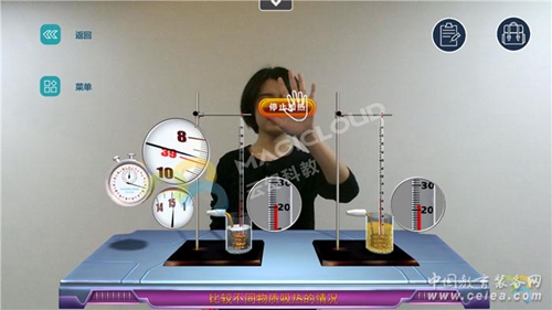 AR實踐探究實驗室,綜合應用AI和AR技術,通過3D建模虛擬再現真實的實驗場景,借助先進的體感交互設備Kinect進行虛實互動,將真實的老師與虛擬仿真的實驗器材結合到一個畫面里,老師實現無需佩戴任何體感設備,純手勢就可以進行實驗互動教學。AR實踐探究實驗室覆蓋物理、化學、生物等學科,適用于中學物理實驗室、化學實驗室、生物實驗室等。