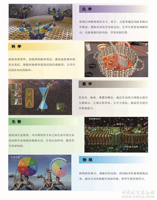 以3D互動教學資源庫為核心,可選擇3D投影機、3D一體機、3DLED等硬件設備,不僅適用于中小學常規教室、實驗室、報告廳、大禮堂等教學場所,還適用于校道、飯堂等公共活動場所。