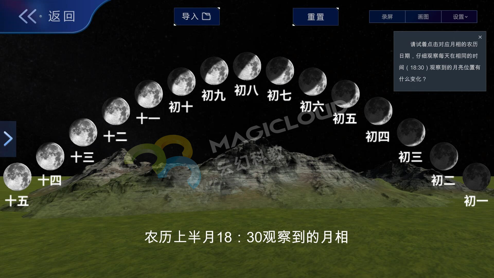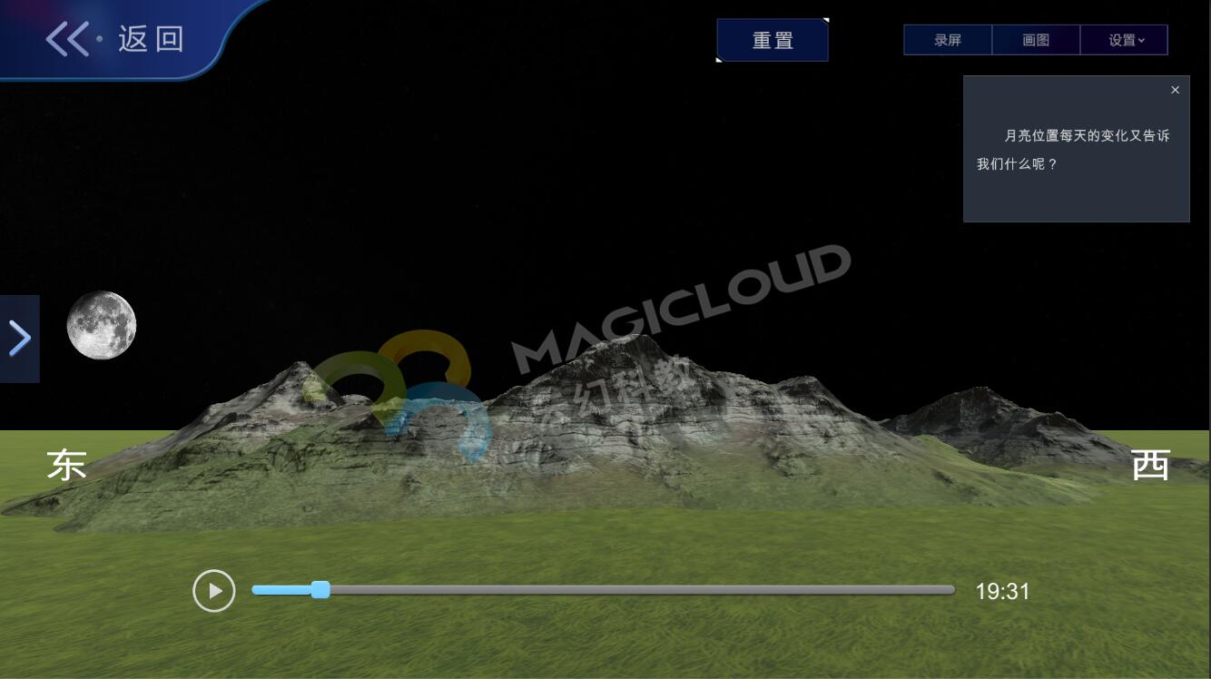 云幻科教AR科學仿真實驗平臺月相變化板塊設計分為月相變化的原因、給月相排序、探索月相變化、觀察晚上的月相、小試牛刀、拓展應用六個板塊,在常規教學的基礎上進行擴充,全面覆蓋月相變化教學內容,為教師教學提供豐富的素材。