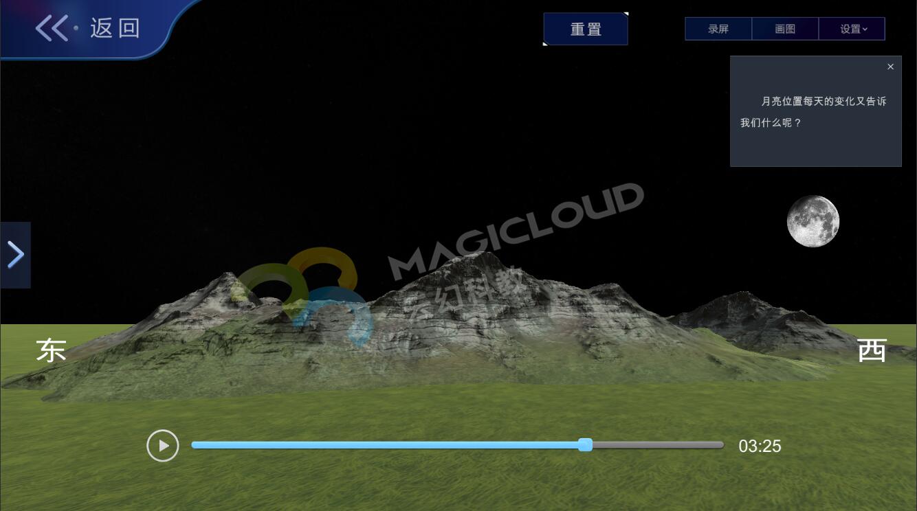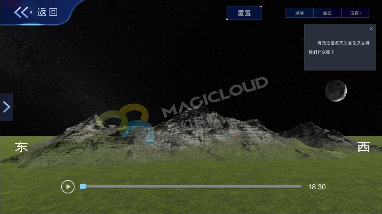 在教學過程中,不僅僅是要學生學得月相變化的知識內容,更是幫助學生完成科學概念的建構,培養學生良好的科學思維和科學態度。云幻科教AR仿真實驗平臺從課本教材出發,提供專業、全面的教學內容,引導學生對物質世界有更深刻的認識,同時對教學內容進行擴充,將科學知識與生活場景關聯,讓學生能夠用所學的知識解釋生活中的有關現象、解決有關實際的問題,引導學生在已知內容基礎上進行再創新與再創造。