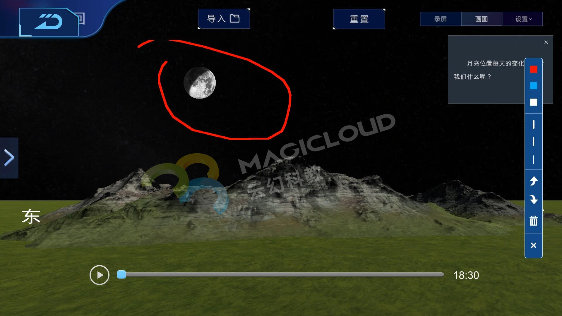 在常規教學中,一般教學環節為畫月相、給月相排序、模擬月相變化、觀察白天的月相等。教學環節中會遇到一些問題,如所畫月相是否正確、天氣影響無法觀察月相、觀察周期較長等等。云幻科教AR科學仿真實驗平臺可以融入常規課堂教學環節,讓課堂教學變得更豐富、更有趣。