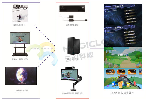 AR仿真實驗室解決方案包含物理、化學、生物、科學學科,綜合應用AI和AR技術,通過3D建模虛擬再現真實的實驗場景,借助先進的體感交互設備Kinect進行虛實互動,將真實的老師與虛擬仿真的實驗器材結合到一個畫面里,老師實現無需佩戴任何體感設備,純手勢就可以進行實驗互動教學。現實手勢與虛擬場景無縫銜接,通過不同主題的深入學習和模擬實踐,引導學生打開思維全面思考,提高實踐動手能力和實踐創新能力。