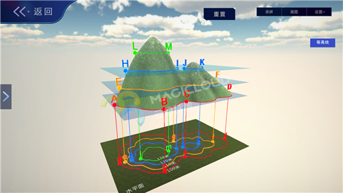 云幻科教AR地理仿真實驗資源制作等高線的地形模型,使用不同顏色標注不同海拔的等高線,便于學生理解等高線地形圖的繪制原理,通過不同的地形模型,引導學生認識各種地表形態的名稱、特點,輕松學習地理知識。
