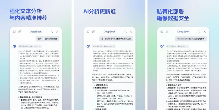 DeepSeek的大模型憑借強大的自然語言處理能力,能夠高效解析文本內容,結合語境和語法結構等多個維度,為教育產品提供精準的內容匹配與推薦。自動化的分析大幅提升了數據處理效率,優化了教學資源的分配與呈現。