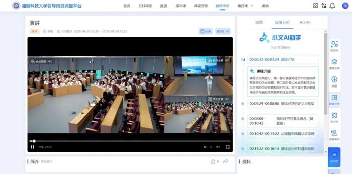 小文AI助手是文香智慧教育平臺的核心組件,為師生提供智能、精準、便捷的教學輔助體驗。具備智能段落分析能力,能夠對課程視頻進行精準切分和內容識別,學生可一鍵跳轉至感興趣的內容段落。同時通過知識點梳理,智能化展現教學過程關鍵節點,以結構化呈現,邏輯清晰,有助教師優化教學策略,提升教學效果。