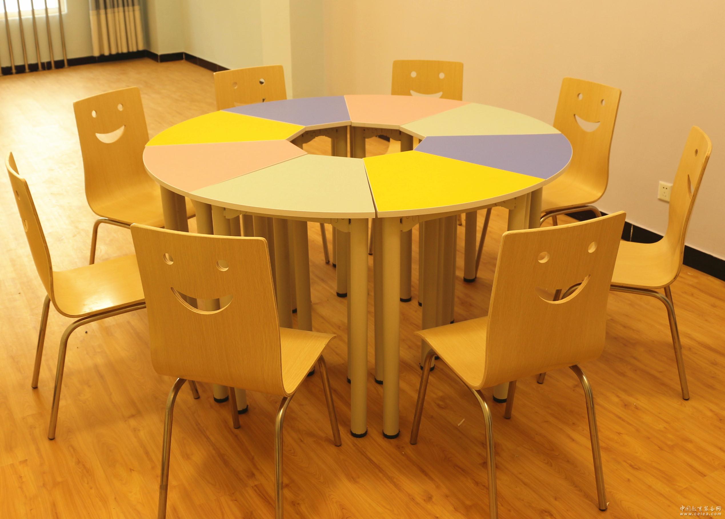團體輔導桌,包括專用扇形桌6或8張,配以適合心理咨詢室使用的帶有微笑鏤空靠背的環保曲木椅。采用環形組合桌,6個扇形組成,6種顏色。能夠根據團體活動需要,組合成圓形、扇形、方形、S形、C形、X形等十幾項排列方式,鋼琴烤漆桌面,鋼管噴塑支持架。粉色、淺藍、淺綠等多種顏色搭配。