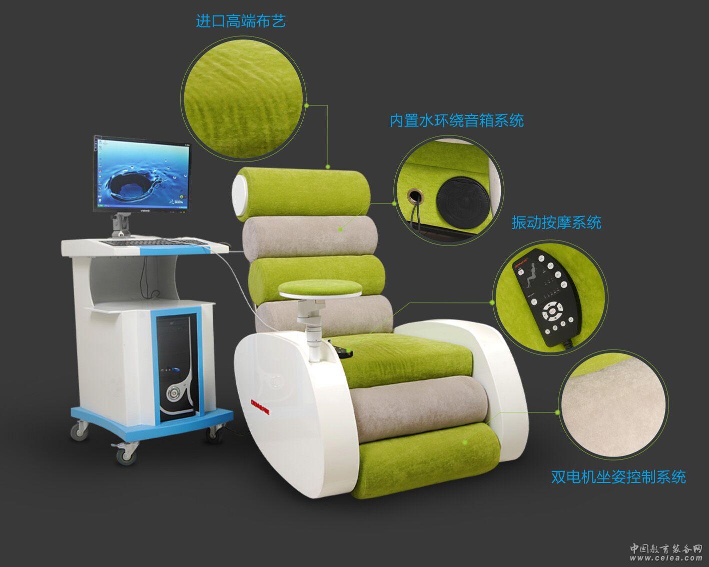 一、【身心反饋B型音樂放松椅】產(chǎn)品描述 產(chǎn)品描述:1、音樂隨動音樂放松椅 1臺:進口高端布藝沙發(fā),實木鋼琴烤漆左右扶手,木和布藝的完美結(jié)合帶獨立萬向舒適圓形手托符合人體工學(xué)設(shè)計。 a硬件參數(shù):產(chǎn)品尺寸:長112CM×寬90CM×高105CM(椅背收起) 長170CM×寬90CM×高60CM(椅背展開) 產(chǎn)品重量:凈重:45KG; 承載量:100KG 電 源:220V(50Hz) 扶手高:65cm;扶手寬:30cm ;坐高:45cm b震動按摩系統(tǒng):電腦控制頸部、背部、腰部按摩促進血液循環(huán),加強放松效果。 c 遠紅外電磁療加熱系統(tǒng),可以增強放松和舒適度。 d音樂隨動系統(tǒng):可以根據(jù)音樂的起伏激發(fā)非偏轉(zhuǎn)震子運動。增強音樂穿透力,使心理音樂更具有表現(xiàn)力。 e高度集中的控制系統(tǒng):腿部、背部坐姿調(diào)節(jié)和心理音樂播放;按摩控制;遠紅外電磁療均由一個遙控器操控,比起以往獨立控制更為人性化。 f擁有雙電機坐姿控制系統(tǒng):椅子背部和抬腳板獨立的點擊控制,可以單獨完成坐姿調(diào)節(jié),可以根據(jù)身體需要貼切的找到舒適坐姿。 g音響系統(tǒng):內(nèi)置山水環(huán)繞音響系統(tǒng) 2、指夾式生理指標采集儀 1個:不少于3米專業(yè)指脈式脈博指數(shù)、壓力指數(shù),生理指標采集監(jiān)控器,內(nèi)置式數(shù)模轉(zhuǎn)換器,多功能信息轉(zhuǎn)換系器以及數(shù)據(jù)傳輸線。 3、品牌身心反饋主機+19寸液晶顯示器1套(內(nèi)置a:音樂反饋系統(tǒng)1套 b:心理視聽資料 1套)
