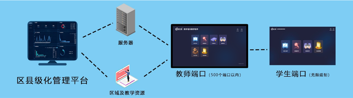 數(shù)字化音樂教學平臺是通過區(qū)/縣的服務器,建設區(qū)級/縣/校級教學平臺,結合配套教學內(nèi)容,輔助區(qū)/縣或學校開好、開齊音樂課,讓孩子享受優(yōu)質的教學資源,更好的提升孩子音樂知識水平,推進區(qū)/縣或學校的美育素養(yǎng)發(fā)展。