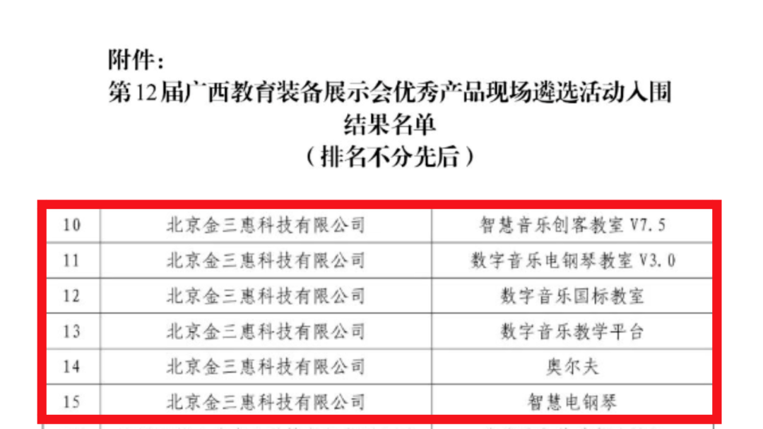 2023年8月10日,廣西教育裝備行業協會發布《關于公布第12屆廣西教育裝備展示會優秀產品現場遴選活動入圍結果的通知》,金三惠自主研發的六種教育裝備——智慧音樂創客教室V7.5、數字音樂電鋼琴教室V3.0、數字音樂國標教室、數字音樂教學平臺、奧爾夫、智慧電鋼琴從眾多參評產品中脫穎而出,榮譽登榜!