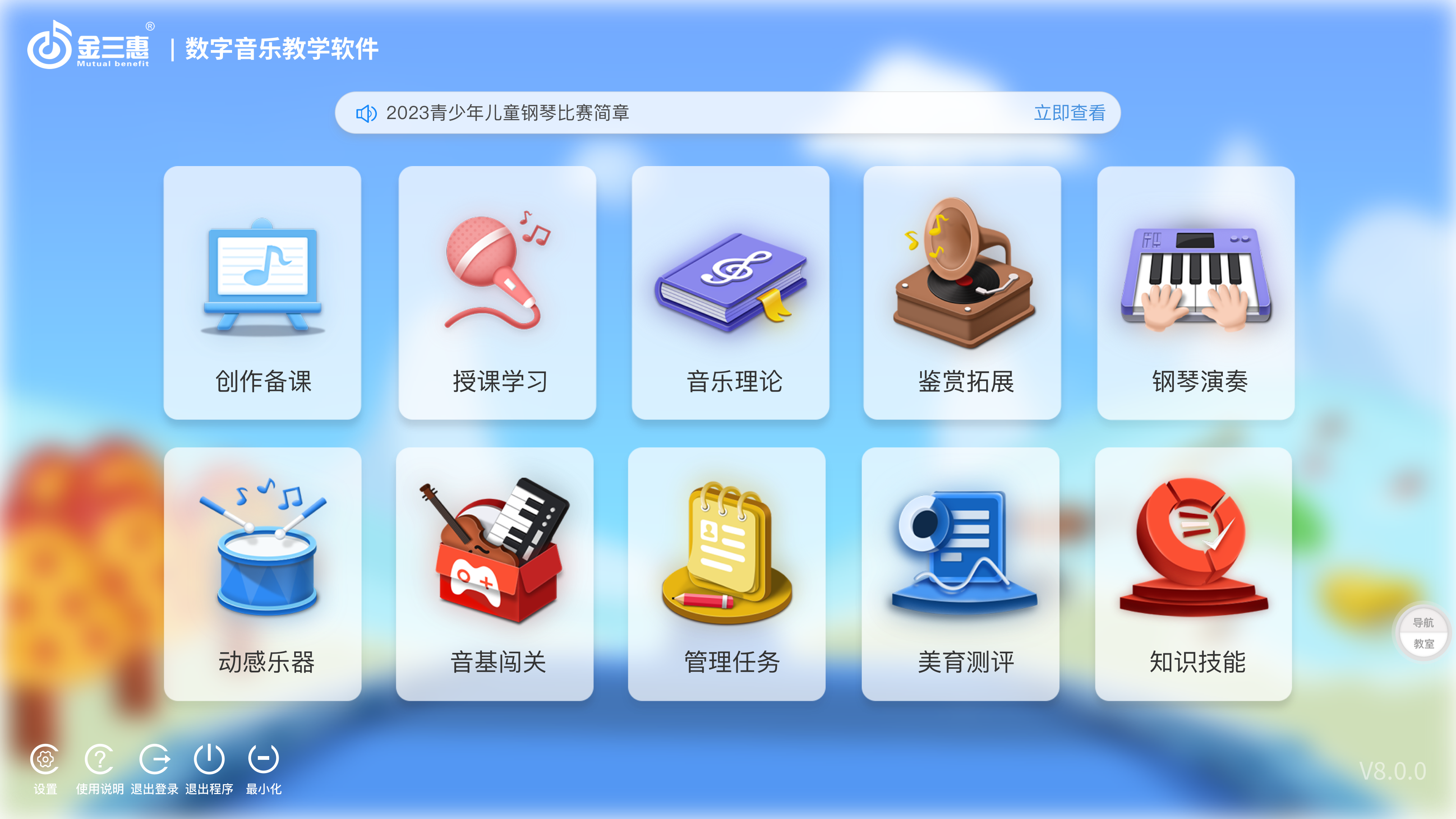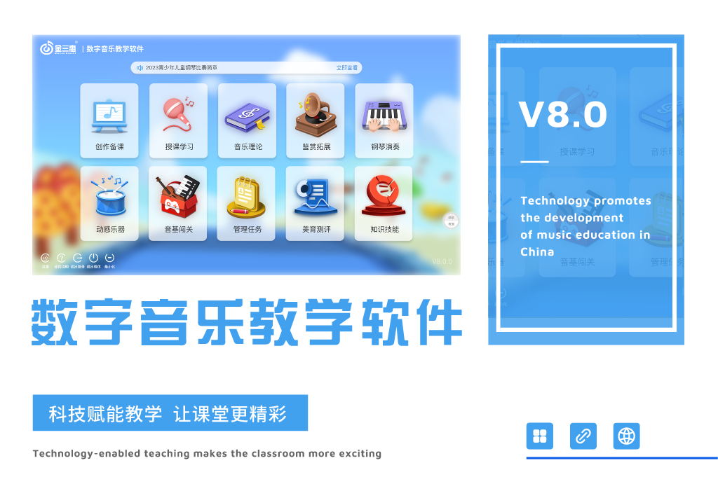 全國(guó)數(shù)字化音樂(lè)教學(xué)系統(tǒng)的開(kāi)創(chuàng)者,教學(xué)內(nèi)容包括歌唱教學(xué)、音樂(lè)欣賞、教學(xué)管理、音樂(lè)測(cè)評(píng)、樂(lè)器演奏、師生互動(dòng)、教師備課等。