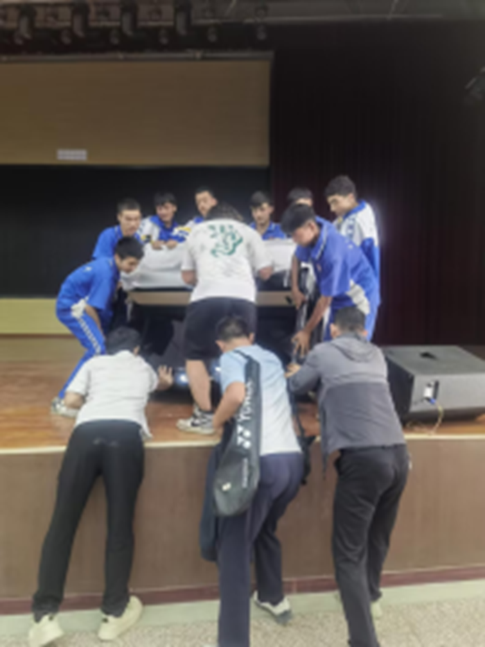 師生齊心協(xié)力將鋼琴搬上講臺(tái)