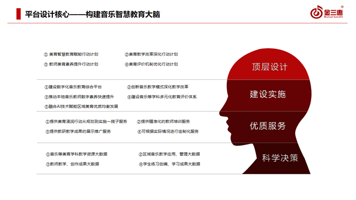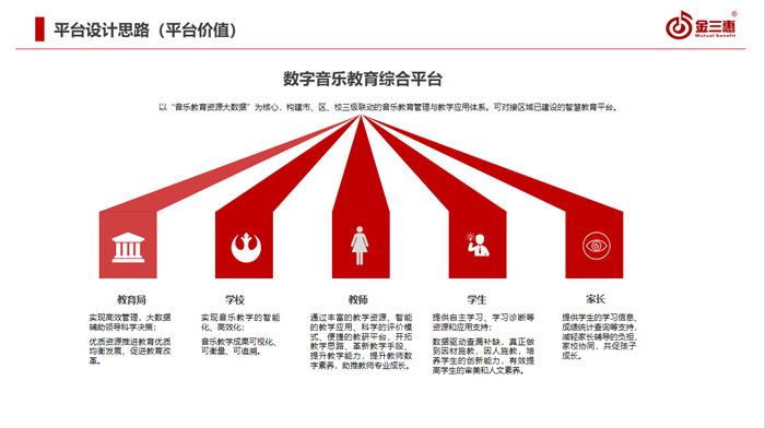 金三惠數字音樂教育綜合平臺緊跟教育部印發關于《關于全面加強和改進新時代學校美育工作的意見》、《教育信息化2.0行動計劃》、《教師數字素養》等政策文件,在教育數字化建設飛速發展的趨勢下應運而生,平臺由音樂教學軟件平臺、音樂測評訓練平臺、數字教學資源、數字音樂管理平臺組成,是音樂教育管、教、學、評一體化解決方案。