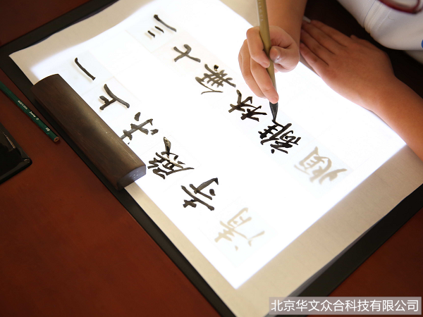 有意思的是,北京華文眾合書法實驗室在推送智慧書法平臺時,不光是為學校引進設備,還負責教室室內配套裝修設計,將書法教室整體氛圍與書法平臺融合起來,古香古色,環境清幽,再加上每張平臺上裝備齊全的硯筆紙墨,既充滿時代感,又不失傳統藝術底蘊,非常吸引年輕人加入其中。