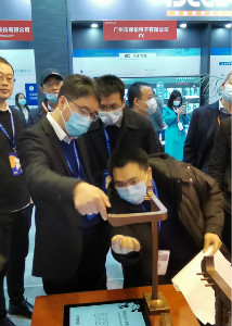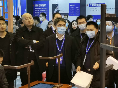 ▲華文眾合工作人員向浙江省教育廳副廳長陳峰講解設(shè)備