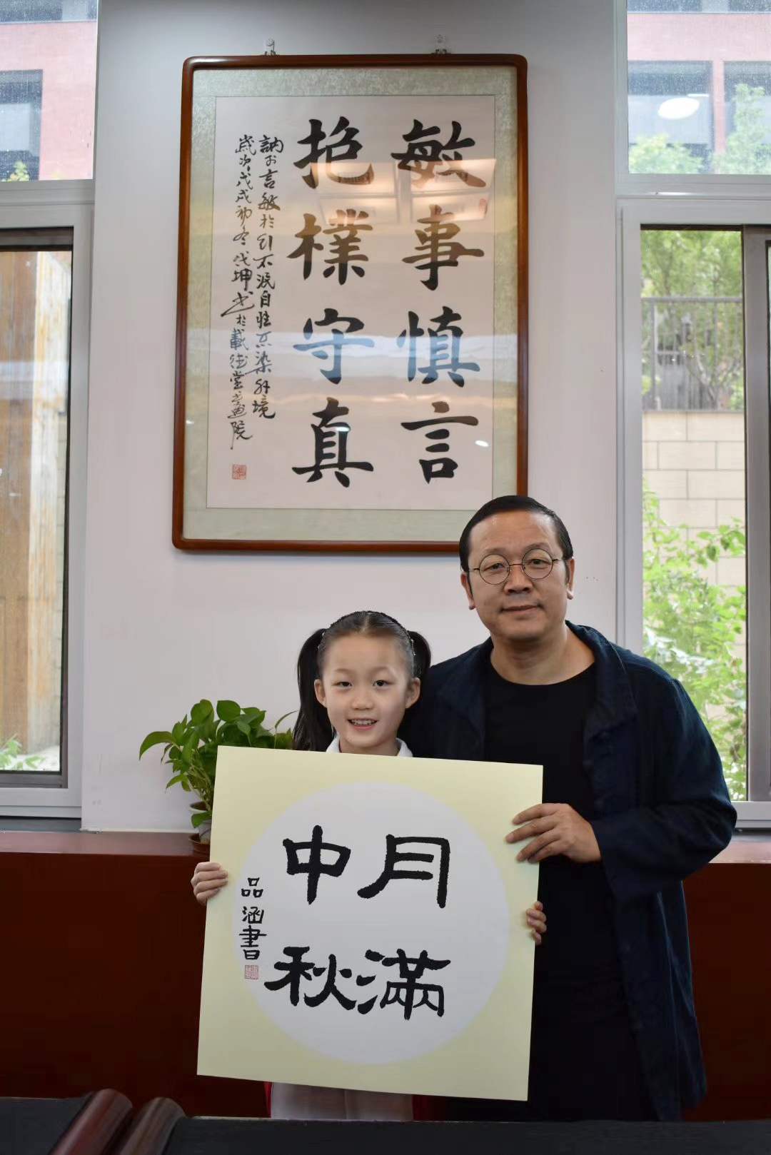 人大附中豐臺學(xué)校學(xué)生衛(wèi)品涵與書法老師何代坤合影