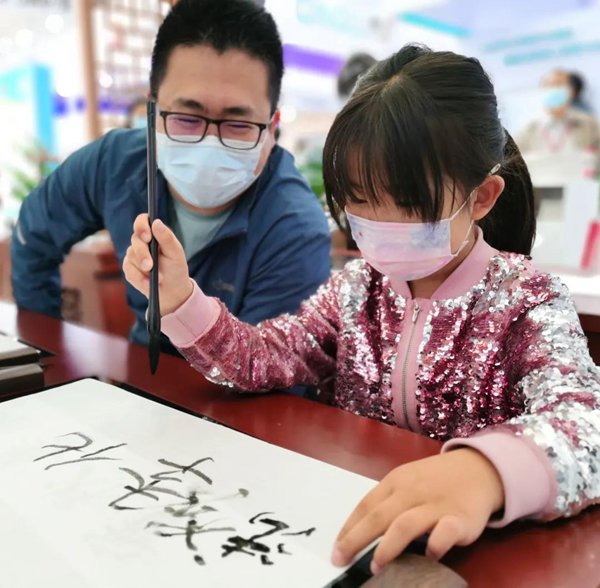 華文眾合展位人氣爆棚參觀者紛紛拿起毛筆