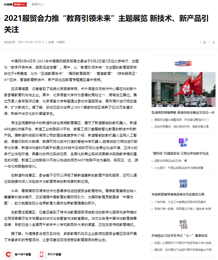 歷時6天的2021中國國際服務貿易交易會(簡稱“服貿會”)于9月7日在北京閉幕。以“教育引領未來”為主題的教育專題展區收獲多家媒體的報道和觀眾的關注。其中作為服貿會教育專題展區中唯一一家“傳統與科技相結合”“弘揚中國書法文化”的智慧書法教育裝備企業,華文眾合智慧書法教室憑借先進的理念使中國傳統書法在服貿會這一國際舞臺之上大放異彩。下面就跟隨各大媒體鏡頭,看一看華文眾合在服貿會上的精彩表現吧!