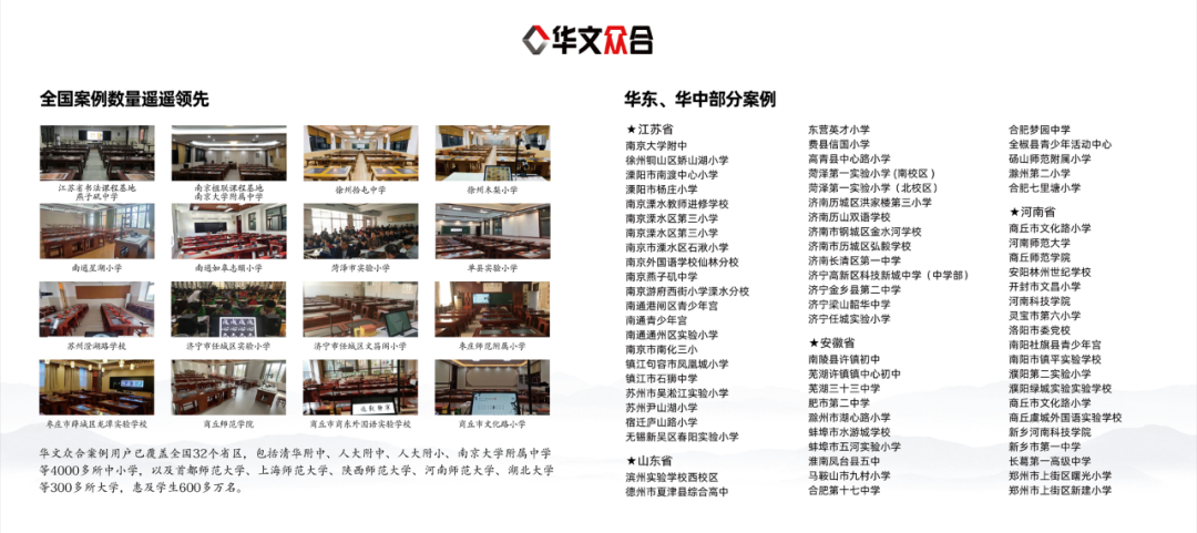 目前,華文眾合智慧書法教室已走進(jìn)全國(guó)4000多所中小學(xué)以及300多所大學(xué),包括清華大學(xué)附屬中學(xué),中國(guó)人民大學(xué)附屬中學(xué)及附屬小學(xué)、首都師范大學(xué)等名校。在淮海經(jīng)濟(jì)區(qū)擁有眾多優(yōu)質(zhì)案例,包括南京大學(xué)附屬中學(xué)、江蘇省書法課程基地-燕子磯中學(xué)、濟(jì)南歷山雙語(yǔ)學(xué)校、合肥第十七中學(xué)、河南師范大學(xué)等。