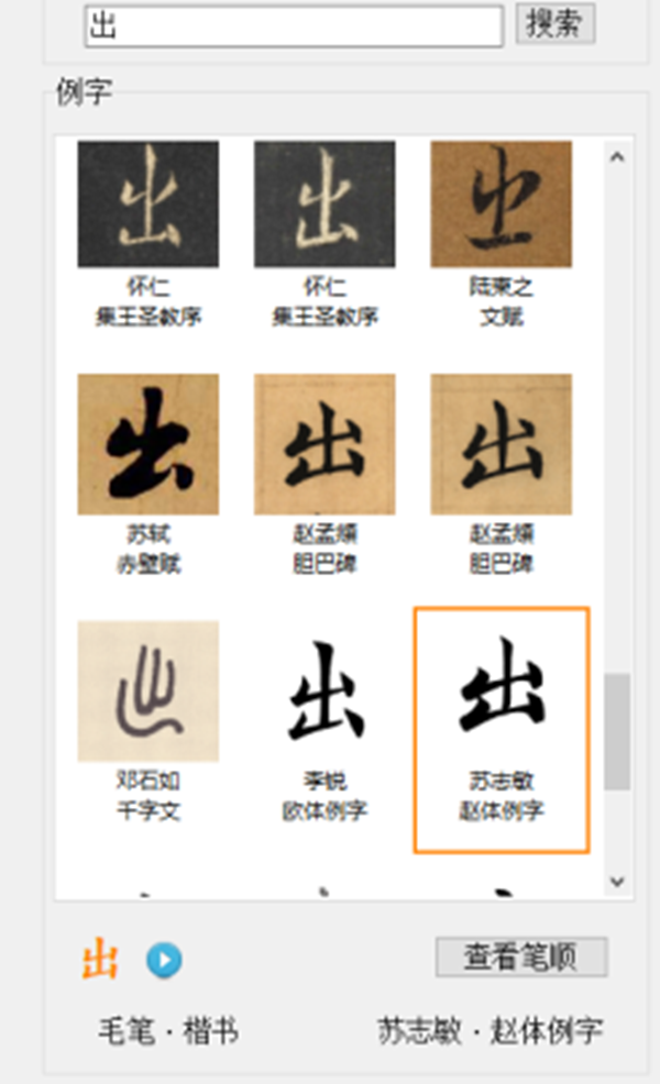 (4)所選單字下方會顯示此字的作品來源及書體,可以查看所選單字的筆順及現(xiàn)代字體的書寫視頻;