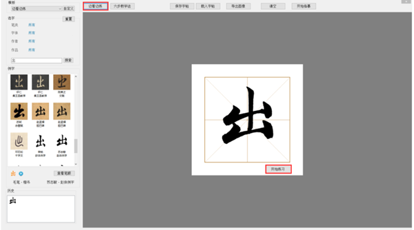 (6)可選擇“邊看邊練”,在字庫里選擇現(xiàn)代書法家字帖,點擊開始練習;