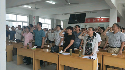 8月13日上午,在汶上縣康驛鎮第二中學大會廳,全體教師儀態端莊,高舉右拳,面對國旗,莊嚴宣誓。高亢激昂的宣誓聲在會議廳久久回蕩,振人心扉。
