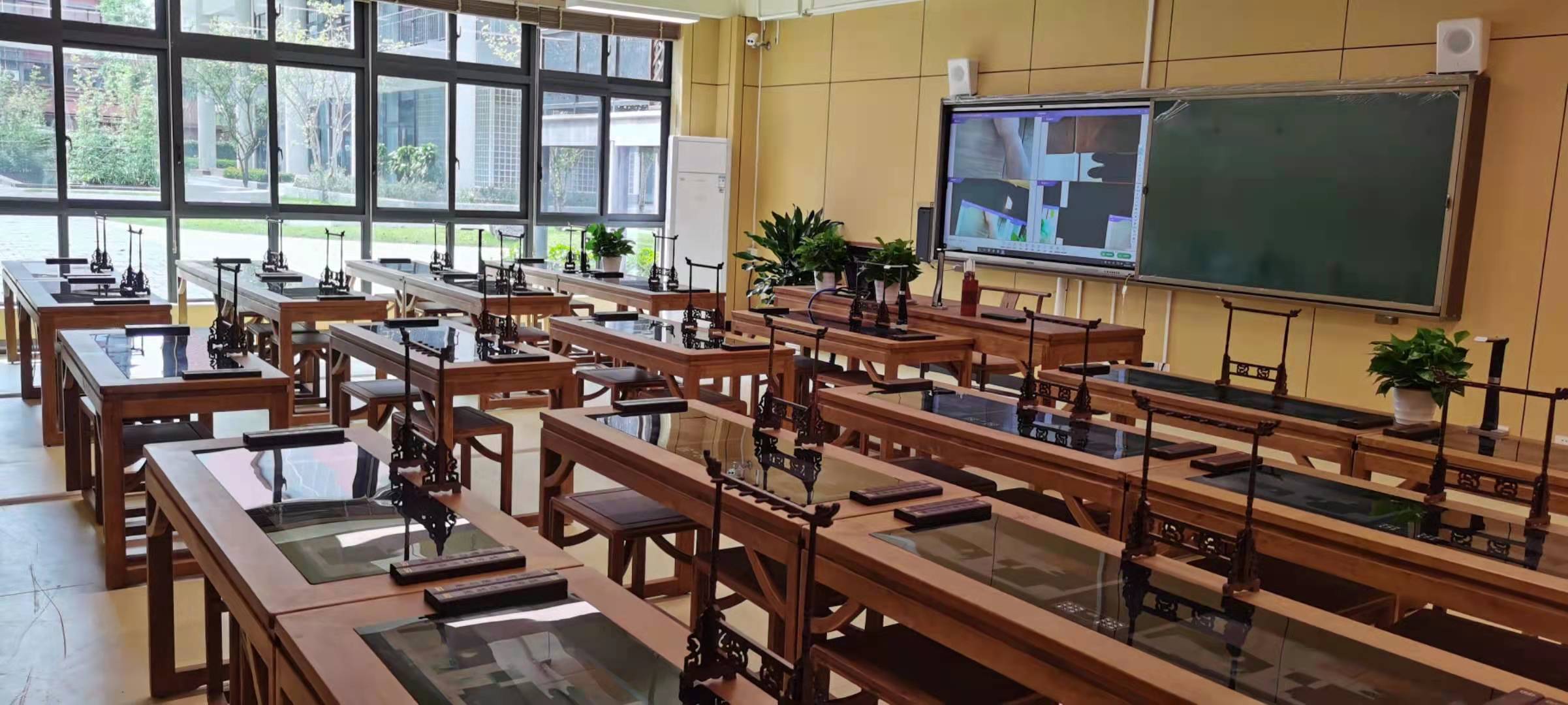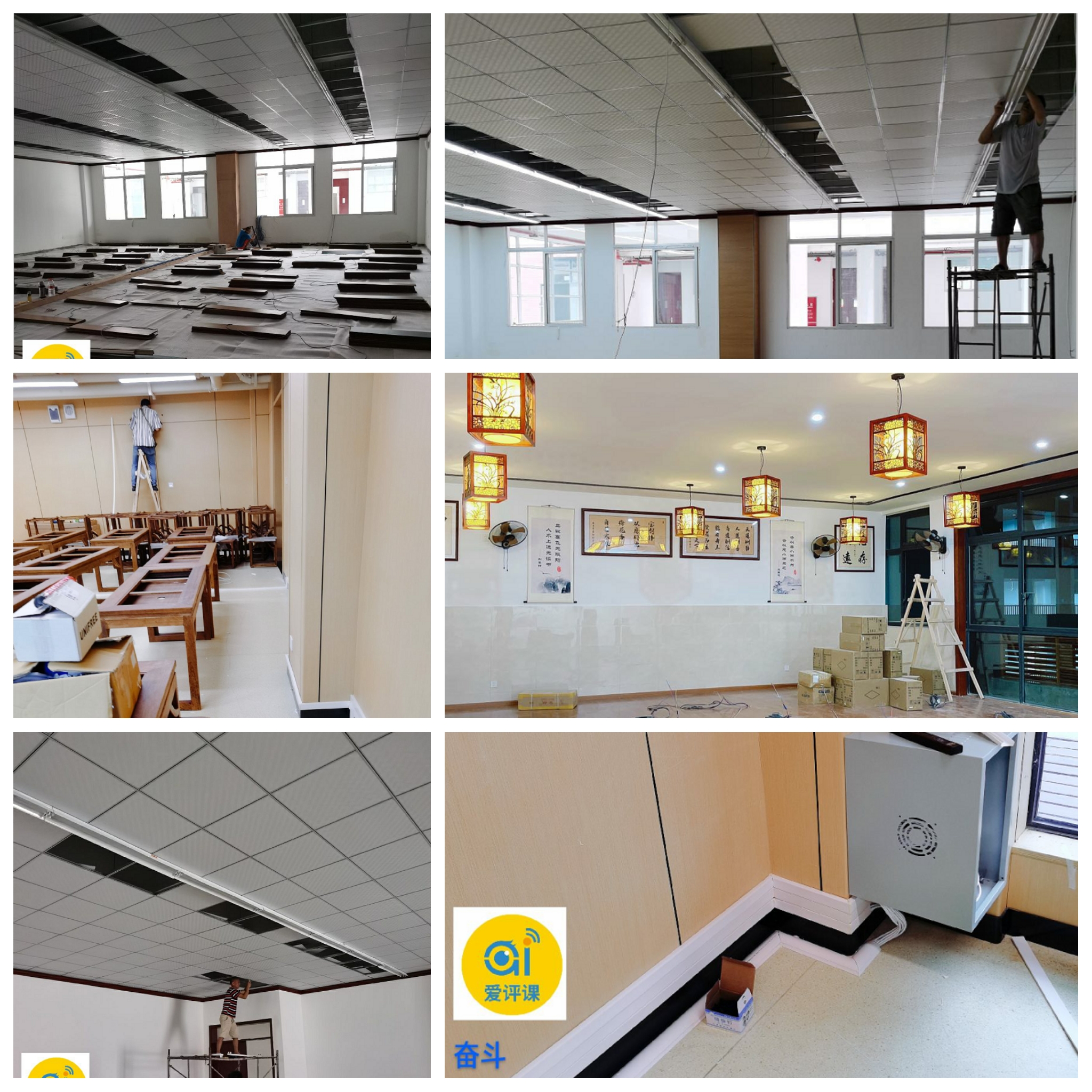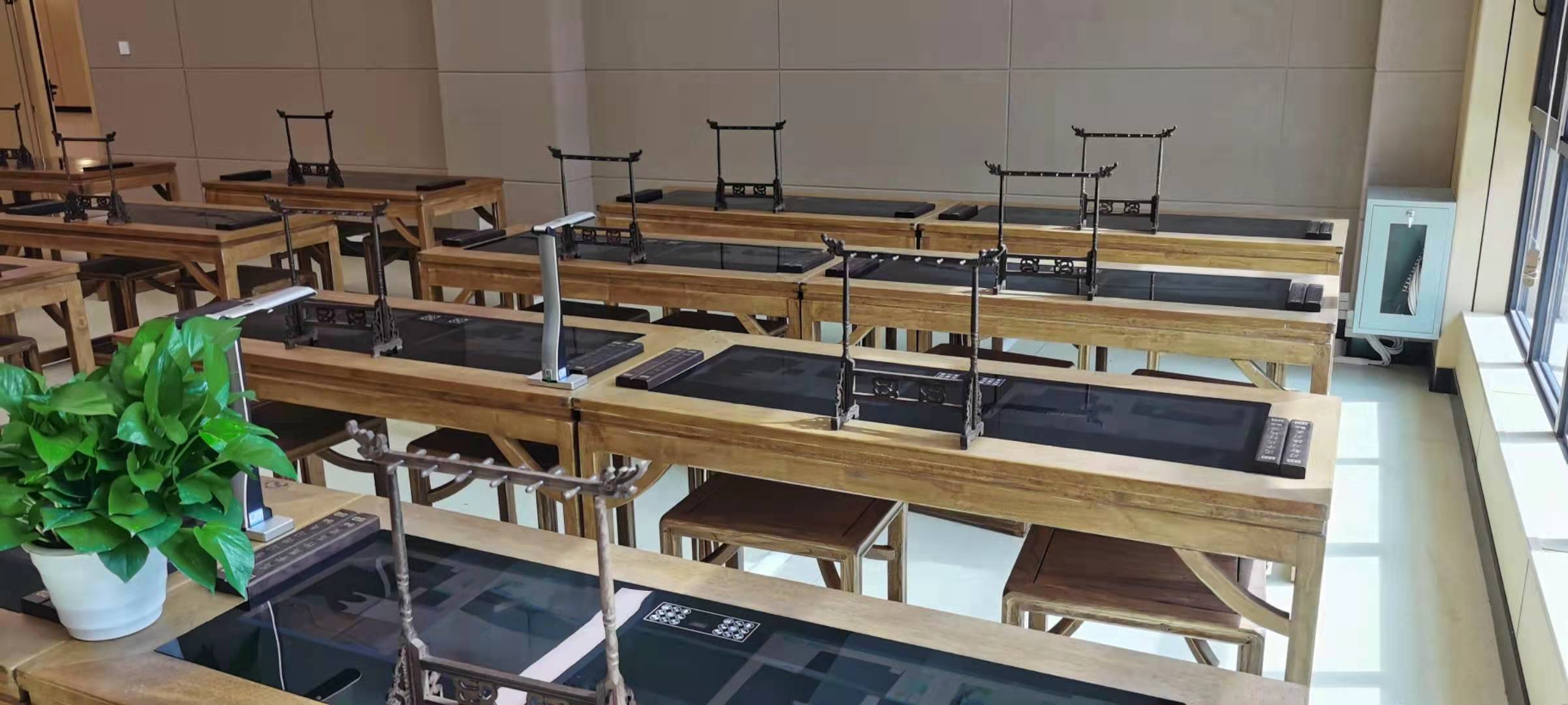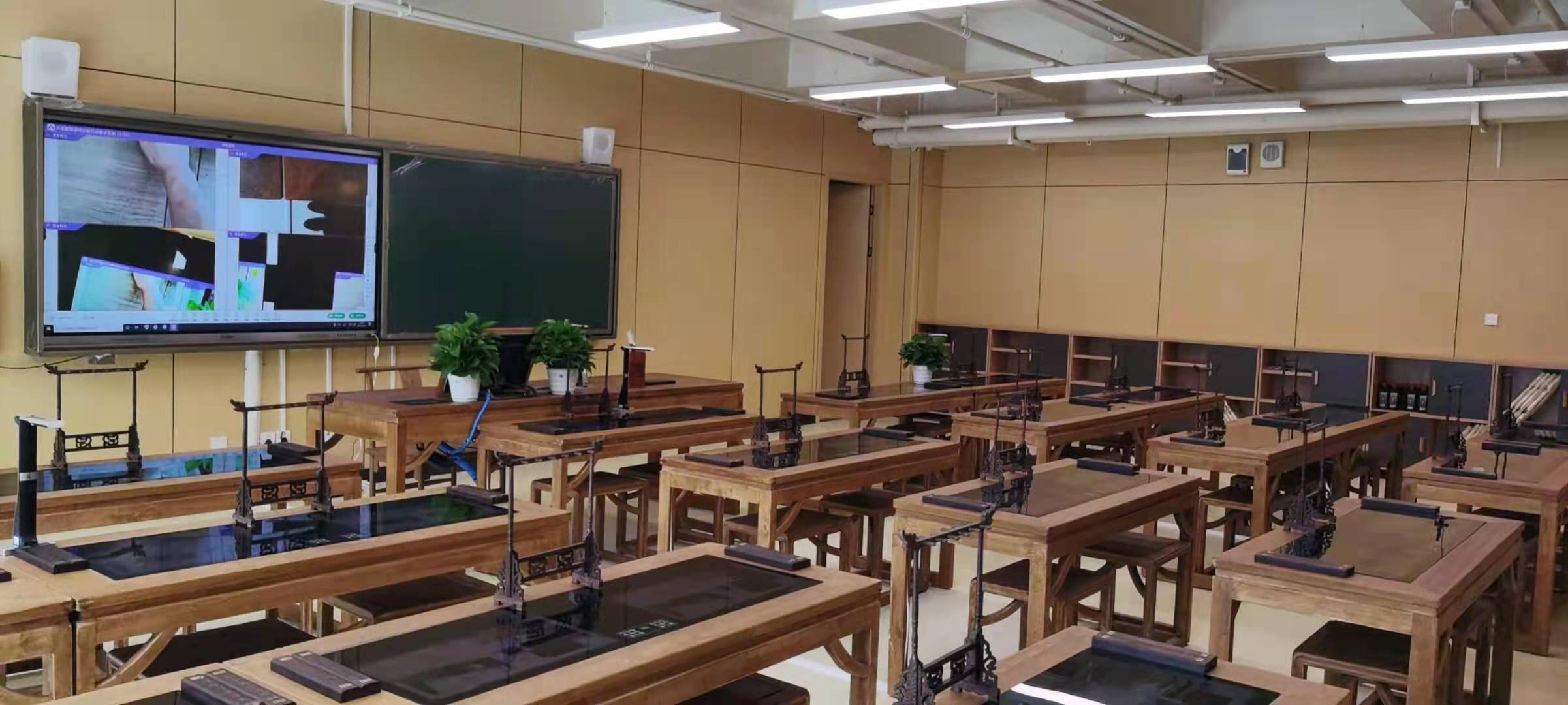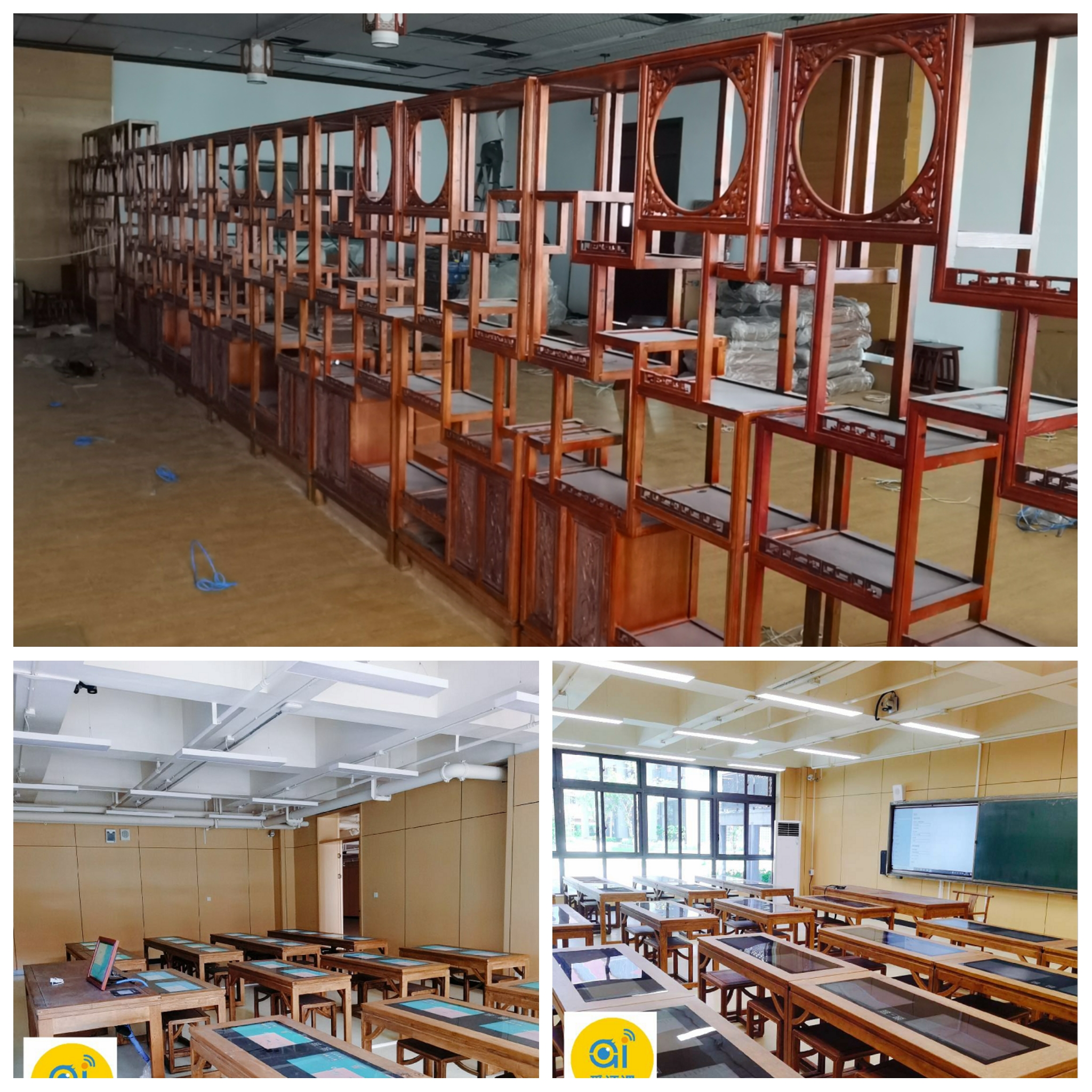 教室布局、開槽網線弱電、吊頂、燈具、老師示范設備、學生臨摹屏、互動主控設備、厚重的實木中國風桌椅,夾水晶頭、每根網線、座位臨摹屏、學生終端、筆洗筆掛,都凝聚了施工同事的責任和堅守。