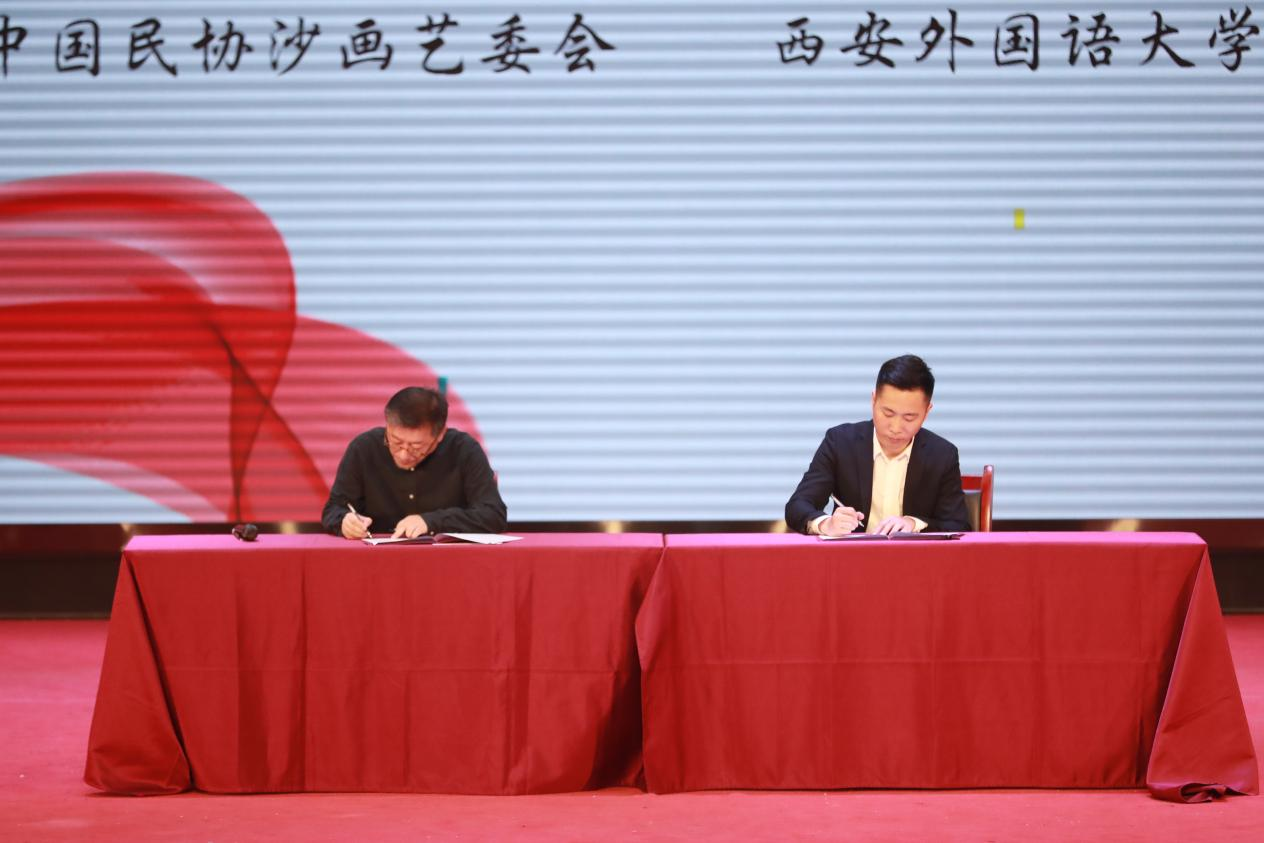 李杰與王義分別代表西安外國語大學(xué)藝術(shù)學(xué)院與中國民協(xié)沙畫藝術(shù)委員會共同簽署了合作協(xié)議。