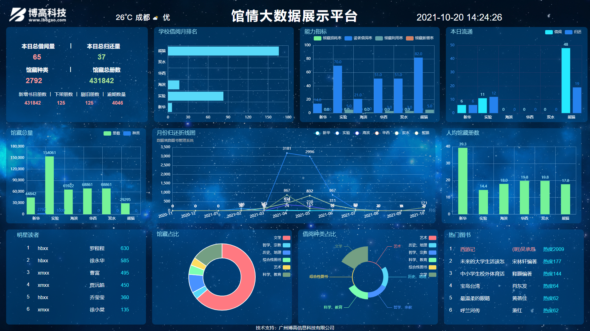 博高智慧閱讀管理(大數據展示平臺或智慧管理運維系統平臺)平臺基于人工智能技術的感知系統,集大數據、物聯網、云計算、人工智能、無線通信等新技術于一體。實現應用子系統的互聯互通,以及數據集成和數據建模等大數據功能,進而充分發揮數據的高階業務價值,對業務管控實現智能聯動、圖形可視、實時調控、高效運營等客戶價值。打造智慧化圖書館,持續性的獲取圖書館客群數據,對數據進行統計與分析,幫助圖書館進行精準化營銷與管理。 系統結合圖書館管理系統、RFID自助借還系統,并集成大數據分析決策、信息推送及薦書系統功能,與微信圖 書館共享后臺數據。對學生的閱讀行為進行深入分析,了解學生的閱讀習慣,發現學生的閱讀興趣點。智慧圖書館信息化建設過程中,獲取不同客群的行為需求,為其提供全方位、多渠道的便利服務,在圖書館中對客群行為數據進行量化統計,提供可持續的精準運營方式,衍生出更大更持續的價值。