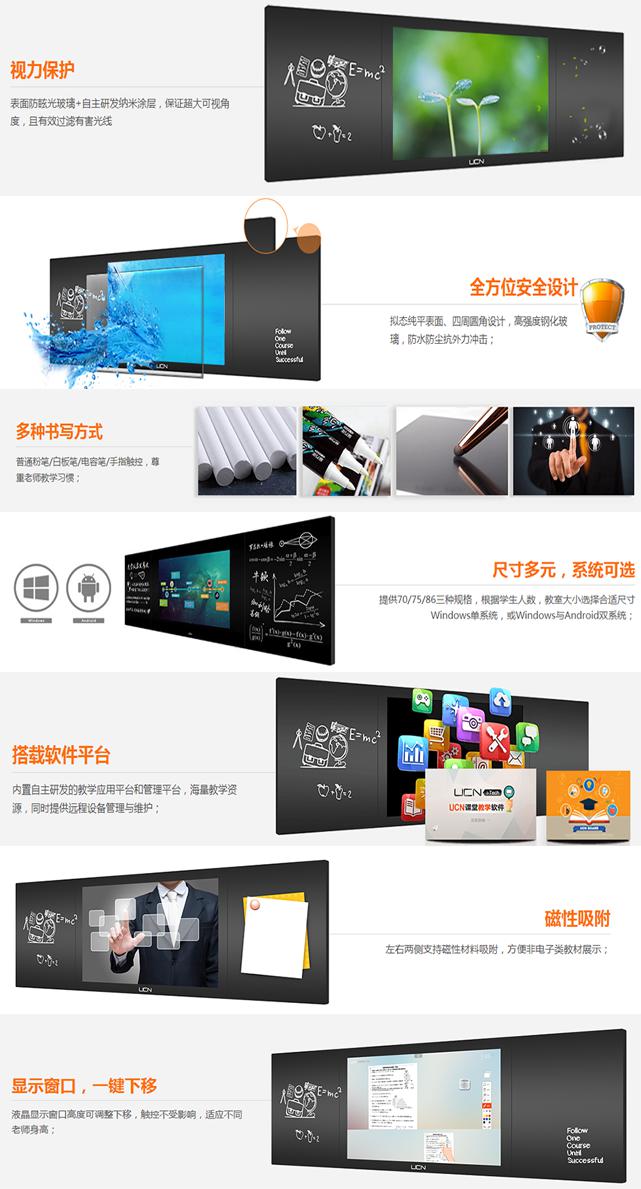 產(chǎn)品詳細(xì)介紹多媒體教學(xué)設(shè)備,納米智能觸控黑板,黑板一體機(jī) 1、多媒體教學(xué)設(shè)備納米智能觸控黑板是由湖南省智慧教育裝備展示體驗(yàn)中心提供免費(fèi)參觀體驗(yàn)0731-84030580。 2、UCN納米觸控黑板,是一個(gè)集成納米觸控、高清大屏顯示、電腦主機(jī)、普通黑板、電視電腦等諸多功能于一身的多媒體教學(xué)平臺(tái)。 3、它尊重師生使用習(xí)慣,將傳統(tǒng)教學(xué)黑板和可感知交互的智能黑板無縫對(duì)接,既可全屏粉筆書寫,又具多媒體教學(xué)功能,操作模式簡(jiǎn)潔;同時(shí)內(nèi)置專業(yè)教學(xué)軟件、應(yīng)用平臺(tái)及管理平臺(tái),老師可靈活運(yùn)用教學(xué)工具,分享調(diào)用優(yōu)質(zhì)教學(xué)資源,遠(yuǎn)程管理維護(hù)升級(jí); 4、產(chǎn)品尺寸:長(zhǎng)度≥4200mm ,寬度≥1200mm ,厚度≤70mm;正面顯示由三塊拼接而成的純平面黑板,無推拉式結(jié)構(gòu),一體化設(shè)計(jì),無任何外露連接線; 5、整個(gè)黑板平面滿足白板筆、無塵粉筆和普通粉筆書寫的功能,書寫流暢,字跡清晰; 6、產(chǎn)品采用超薄金屬包邊,圓角結(jié)構(gòu),安全可靠;壁掛式安裝,拆卸方便; 7、全屏開關(guān):可在顯示區(qū)域任意位置通過五指按壓開關(guān)屏幕,方便老師操作,并且關(guān)閉屏幕的同時(shí),觸摸功能也自動(dòng)關(guān)閉,防止誤操作; 8、為了適應(yīng)不同身高老師的黑板操作,可實(shí)現(xiàn)液晶屏顯示窗口下移,并可以進(jìn)行正常使用觸摸,方便老師操作; 9、已被廣泛應(yīng)用在教育教學(xué)領(lǐng)域,適用于各學(xué)齡段。 湖南省智慧教育裝備展示體驗(yàn)中心www.ecwee.cn |
