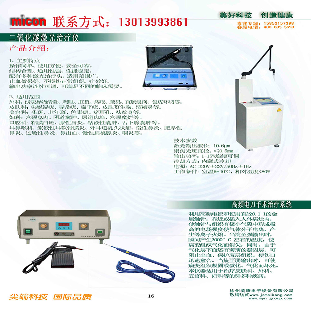 產品詳細介紹產品簡介 二氧化碳激光機 適應癥: 用于對人體組織的切割、灼燒、凝固等,廣泛應用于整形美容科、皮膚科、外科、婦科、耳鼻喉科、口腔科等。 皮膚美容科:色素痣、老年斑、尋常疣、扁平疣、尖銳溫疣、肉芽腫、皮膚良性腫瘤等 普外科:包皮環(huán)切、外痔、肛裂、息肉、雞眼等 婦科:陰道濕疣、陰道息肉、宮頸糜爛、宮頸肌瘤、陰道壁肉瘤、外陰乳頭狀瘤等 耳鼻喉科:慢性鼻炎、肥厚性鼻炎、下鼻早肥大、過敏性鼻炎、鼻息內、慢性扁桃腺炎 咽炎及其它良性腫瘤等。 口腔科:牙齦及牙齦瘤切除術、牙齦成形術,系帶切開術,粘液性囊腫舌下腺囊腫等 技術參數 激光波長; 10.6μm 激 光 管:1000mm 低階模輸出 輸出功率:連續(xù)輸出0.5-30W 峰值功率450W 輸出方式:連續(xù)輸出、單脈沖、重復脈沖 瞄 準 光:紅色半導體激光 光路傳輸:自主開發(fā)的靈活七關節(jié)導光臂,具有f=100mm,f=50mm兩種聚焦刀頭,并配有多科室手術手具。 光 斑:最小光斑直徑≤0.2mm 電 源:AC 220V±10% 50Hz 5A 便攜式二氧化碳激光治療機