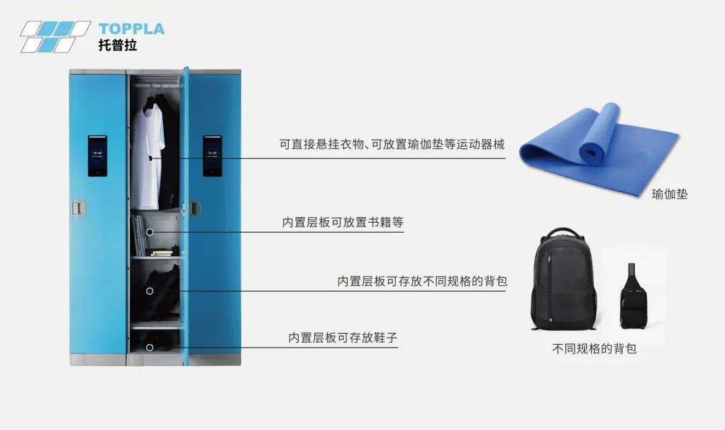 電腦包、背包、運動鞋、換洗衣物、健身裝備,托普拉智能儲物柜應收盡收,內置掛衣桿可垂掛衣服,搭配層板設計分隔柜內空間,提升更衣柜空間利用率。