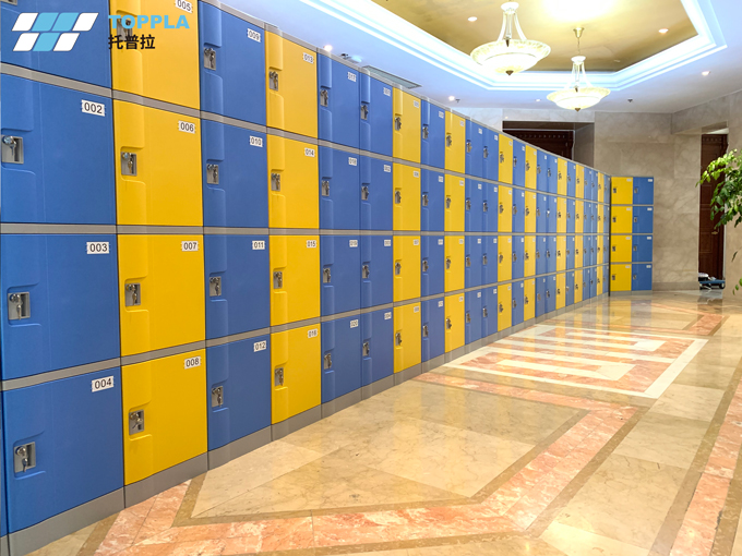 此撞色校園儲物柜解決方案采用托普拉第一代全塑儲物柜T-382S,4門1列、多列組合而成,采用經(jīng)典藍(lán)黃配,大氣不失活力。