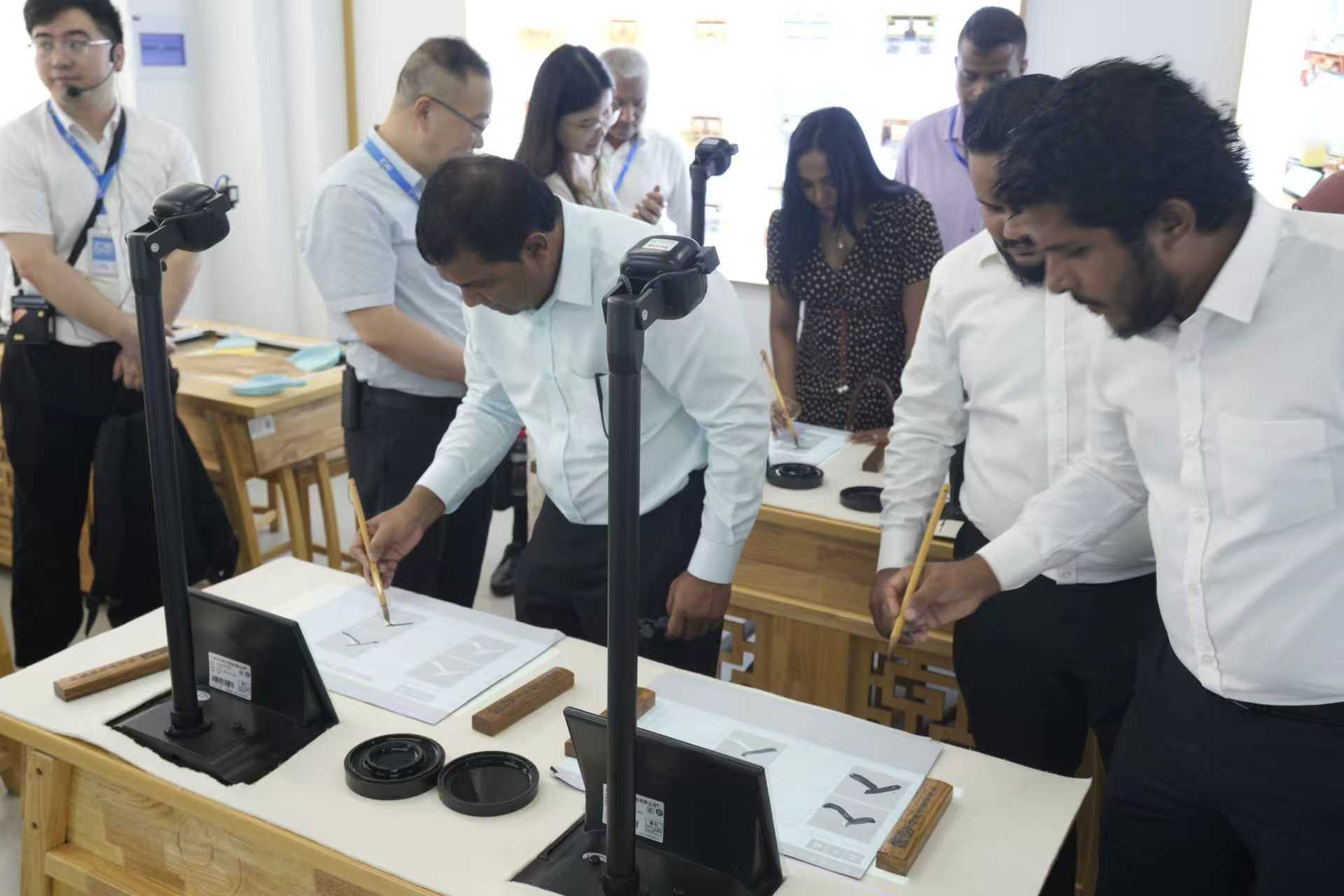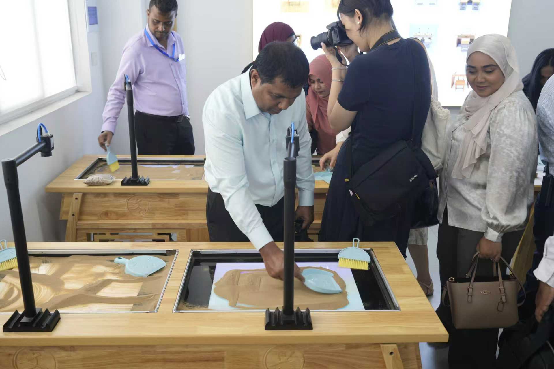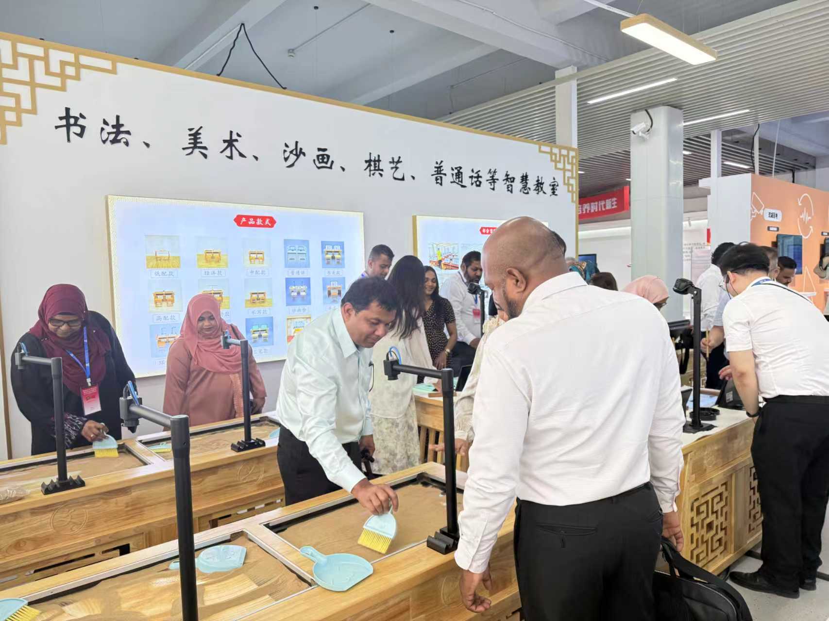 2025年6月30日上午,陽光明媚,充滿了友好與合作的氛圍。馬爾代夫部級官員研討班部長一行來到文興小書家產品展示區,對書法、美術、棋藝、沙畫教室相關產品進行了深入考察,開啟了一場別開生面的國際友好交流之旅。