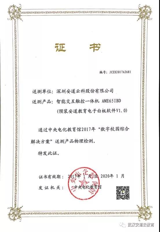 安道教育自主研發的安道交互式智能觸控黑板在眾多數字校園設備中脫穎而出,成功入圍中央電教館2017年“數字化校園綜合解決方案”,為安道智能黑板在全國推廣奠定了堅實的基石。