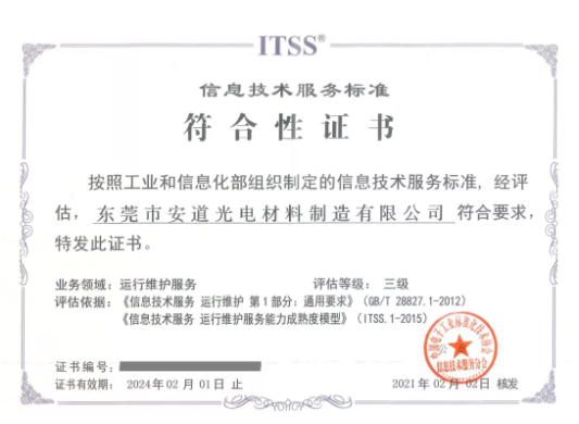 2021年2月,經中國電子工業標準化技術協會信息技術服務分會組織符合性評估專家評審會專業評審,安道教育獲ITSS運行維護服務能力成熟度符合證書。