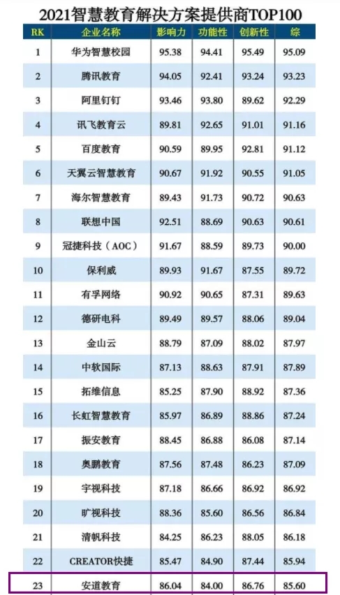 作為教育行業的設備制造商和解決方案服務商,安道教育匠心堅守16載,得到行業和客戶的認可。位列由《互聯網周刊》& eNet研究院發布的《2021智慧教育解決方案提供商 TOP100》排行榜TOP 23,相比去年上升了兩名。