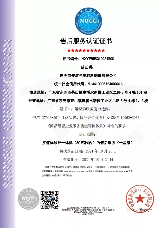 安道教育在提升產品品質的同時,堅持以用戶為中心打造了專業的售后服務體系得到了權威機構認證,獲得十星級售后服務認證。