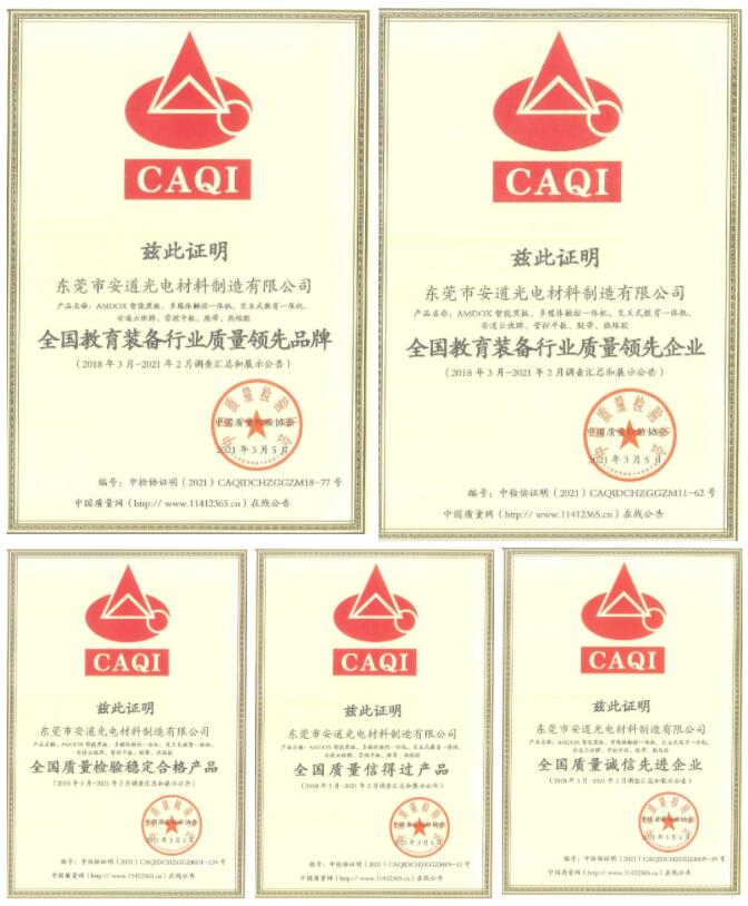 2021年,安道教育還連續斬獲“全國教育裝備行業質量領先品牌”“全國教育裝備行業質量領先企業”“全國質量誠信先進企業”“全國質量信得過產品”“全國質量檢驗穩定合格產品”等榮譽。
