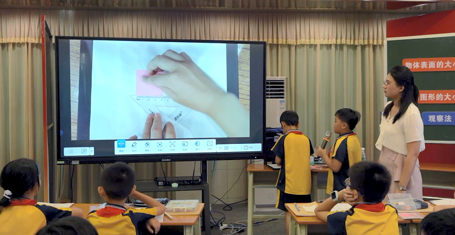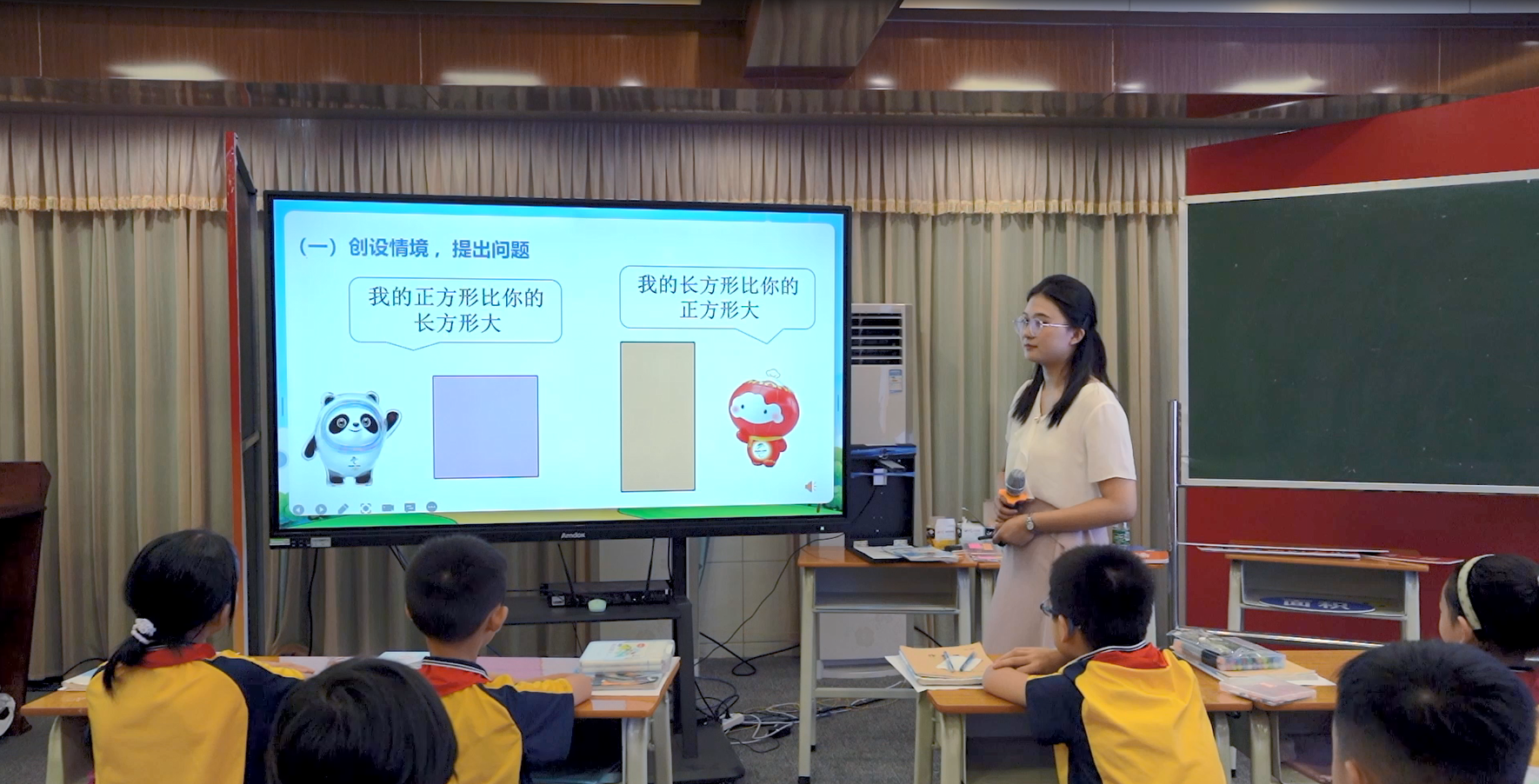 “冰墩墩和雪容融都是孩子們非常熟悉的形象,通過他們爭辯的情景把大家帶到面積的世界里,從聽覺、視覺兩方面同時吸引孩子們的注意力,再引導他們提出面積相關的問題,能夠有效提高課堂教學效果。”陳桃老師說道,巧用安道智能交互教學一體機,導入圖片、音頻創設主題情景,可以將枯燥、深奧的知識場景化、動態化,不僅有利于學生們集中注意力,更能有效引導學生循序觀察,培養學生思考、提出問題的能力,提高學生的思維發展。