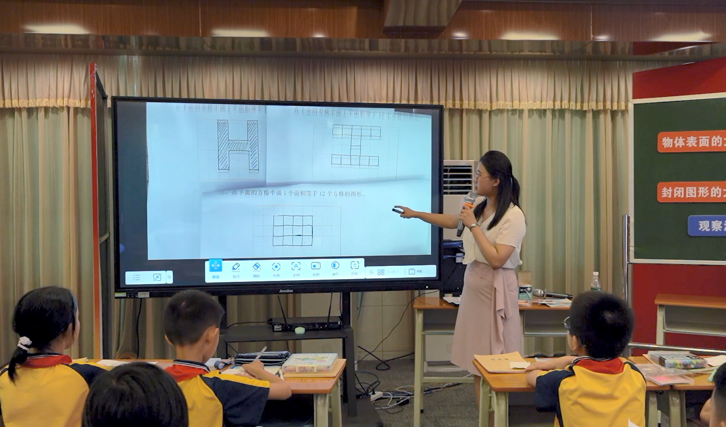 安道智能交互教學一體機的使用,化靜為動,能夠讓學生樹立清晰的概念。課堂上,陳桃老師還利用一體機的移動和動畫功能加深學生對面積的具象感知,激發他們的求知欲。