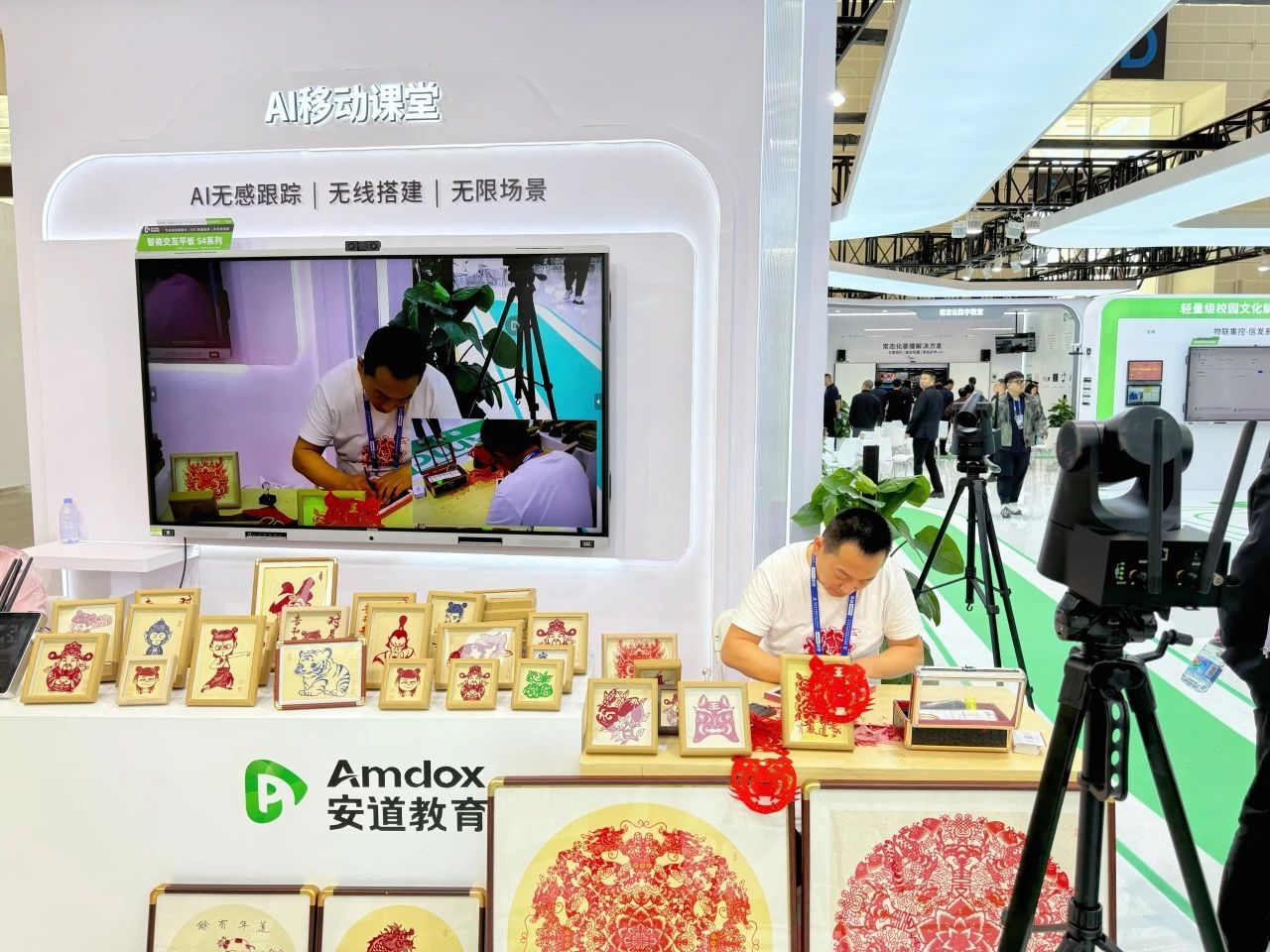 在安道AI移動(dòng)課堂專區(qū),正進(jìn)行著一場(chǎng)別開(kāi)生面的非遺剪紙課堂。現(xiàn)場(chǎng),沒(méi)有傳統(tǒng)便攜錄播系統(tǒng)線路的雜亂,連接復(fù)雜的布局,僅僅只有一臺(tái)便攜錄播一體機(jī)、一臺(tái)無(wú)線云臺(tái)攝像機(jī)、領(lǐng)夾麥克風(fēng),便輕松實(shí)現(xiàn)課堂現(xiàn)場(chǎng)的傳播與錄制。這節(jié)課堂同時(shí)也在線上同步直播,在AI技術(shù)的加持下,剪紙老師的剪紙畫(huà)面被賦予了更多的畫(huà)面特寫(xiě),讓線上收看直播的觀眾也能和現(xiàn)場(chǎng)觀眾一樣收看清晰現(xiàn)場(chǎng)畫(huà)面。