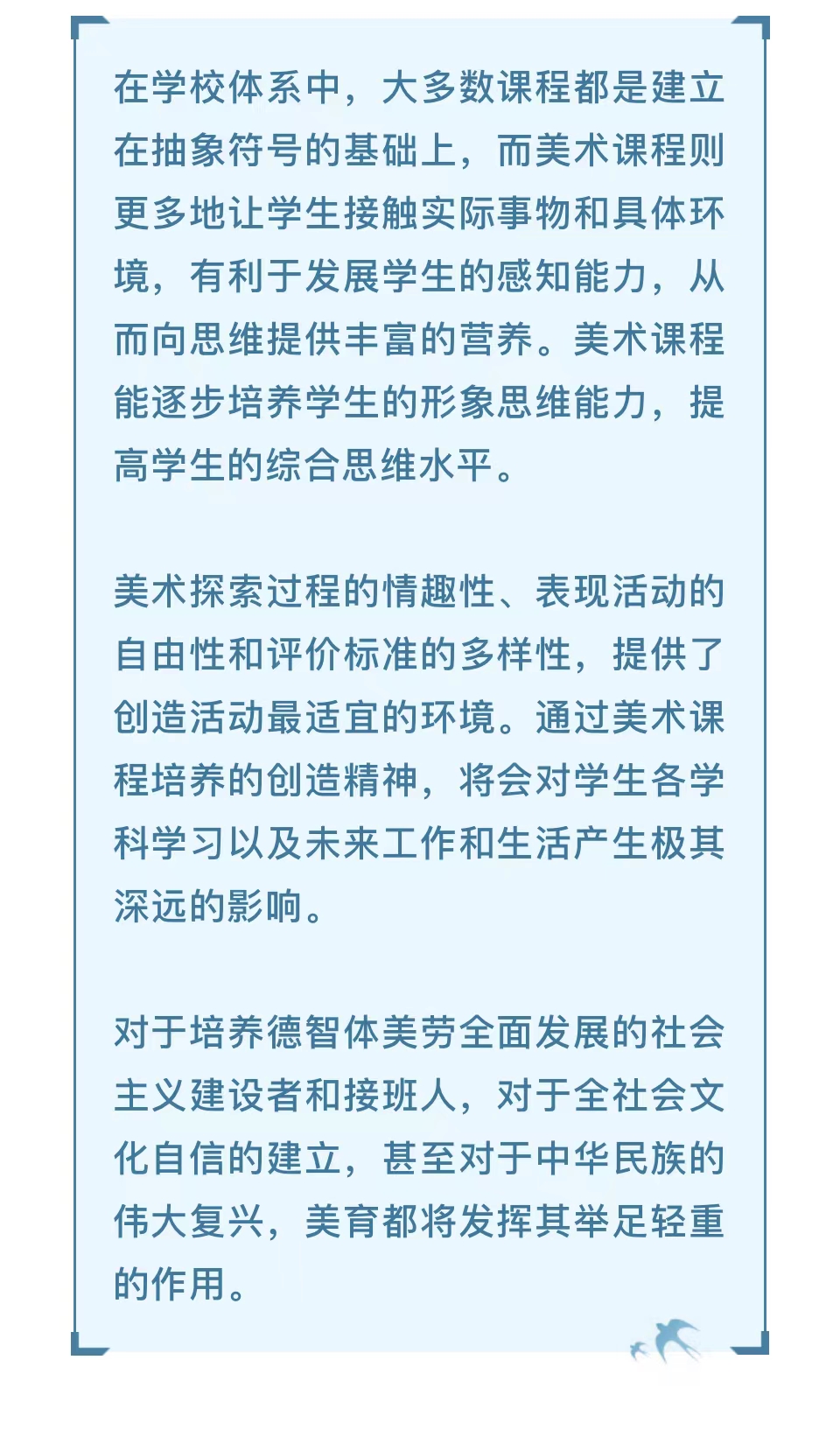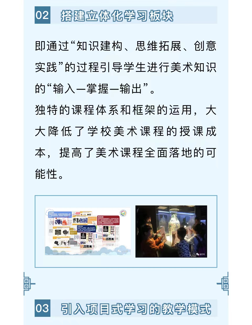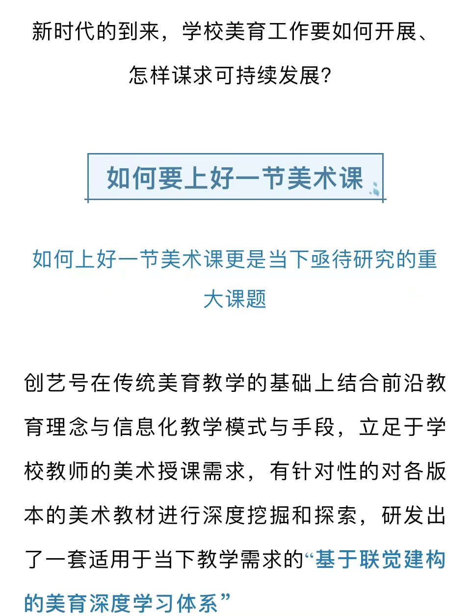 | 區(qū)域美育整體解決方案。創(chuàng)藝號(hào)美育綜合建設(shè)方案,做到“三建設(shè),三提升”,建設(shè)美育創(chuàng)新型課程模式,提升區(qū)域整體教學(xué)能力;建設(shè)美育發(fā)展性評(píng)價(jià)體系,提升學(xué)生藝術(shù)綜合素養(yǎng);建設(shè)美育專業(yè)化場地課程,提升學(xué)校優(yōu)質(zhì)特色發(fā)展,有效服務(wù)美育進(jìn)校園、進(jìn)中考。 |