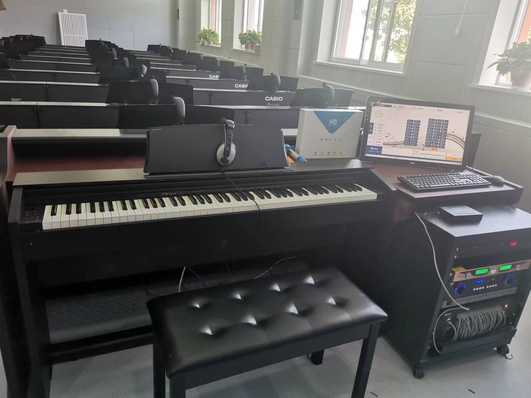 教室使用北京智泰威盈科技有限公司配備的云音樂教室教學系統軟件、耳機、學生終端、音箱、功放、無線話筒等常用設備。