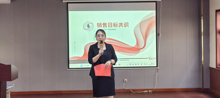 在銷售目標共識環節,市場中心負責人曹春燕女士通過詳實的數據分析,向團隊同步了最新市場動態與行業趨勢。她首先公示了近期業績表現,通過環比、同比等關鍵指標的對比分析,既肯定了團隊取得的成績,也客觀指出了當前存在的提升空間。