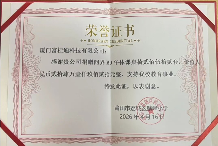本次捐贈儀式,是富桂通踐行社會責任的又一新起點。未來,企業(yè)將繼續(xù)緊跟福建省教育事業(yè)發(fā)展部署,持續(xù)深耕教育公益領(lǐng)域,以更優(yōu)質(zhì)的產(chǎn)品、更務(wù)實的行動、更堅定的擔當,全力助力基層教育設(shè)施改善,為福建基礎(chǔ)教育高質(zhì)量發(fā)展貢獻富桂通力量!