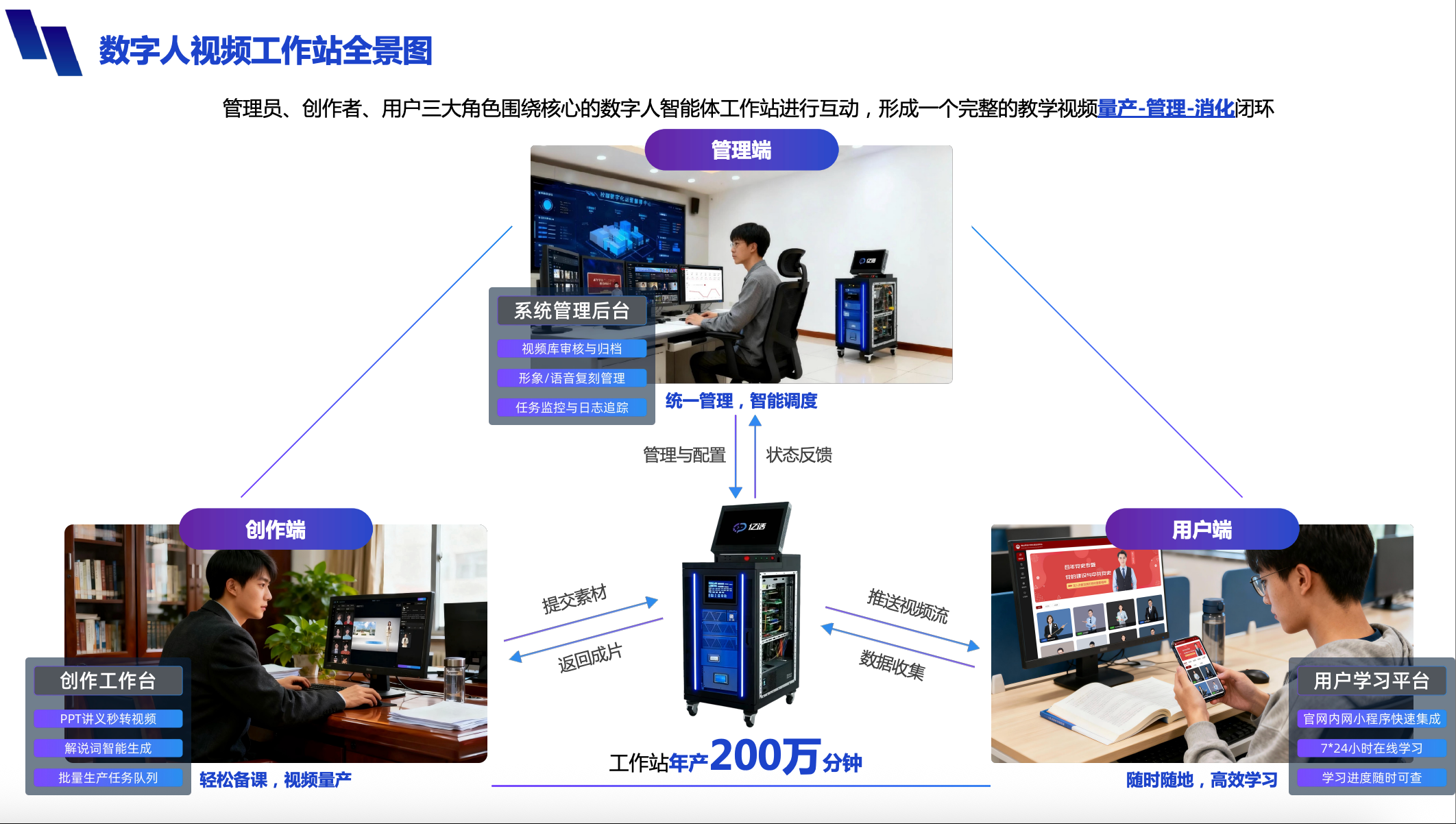 產(chǎn)品詳細(xì)介紹“億話-數(shù)字人智能體工作站全棧解決方案”是八點(diǎn)八數(shù)字科技面向高校推出的教育數(shù)字化一體化平臺,深度融合大模型、數(shù)字人技術(shù)與智能體應(yīng)用,致力于為教師減負(fù)、為教學(xué)增效、為校園賦能。該方案支持**一鍵批量生成高質(zhì)量微課視頻**,將傳統(tǒng)數(shù)日的課件制作流程壓縮至數(shù)小時,助力教師高效構(gòu)建校本資源庫;同時提供**真人級形象與聲音復(fù)刻**,打造親切可信的“數(shù)字教師”,實(shí)現(xiàn)7×24小時智能交互與精準(zhǔn)答疑。系統(tǒng)覆蓋教學(xué)、管理、宣傳、服務(wù)四大核心場景,可靈活嵌入學(xué)校官網(wǎng)、小程序、校園APP等多終端,并支持全棧本地化部署,確保數(shù)據(jù)安全與合規(guī)。目前已在華南理工大學(xué)、電子科技大學(xué)、華東師范大學(xué)等多所高校成功落地,正成為推動高校教育數(shù)字化轉(zhuǎn)型、構(gòu)建智慧校園新生態(tài)的關(guān)鍵基礎(chǔ)設(shè)施。